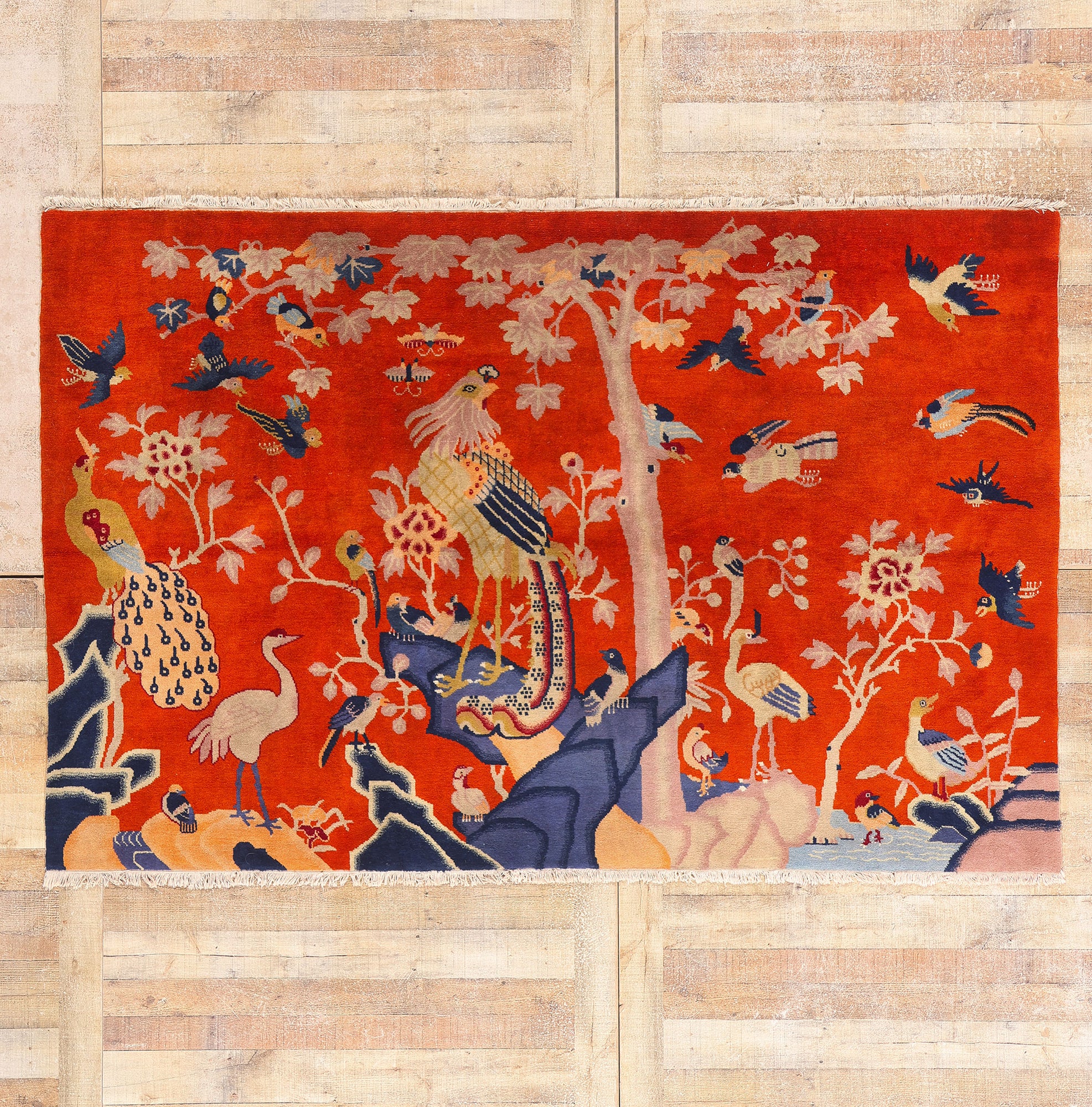 This hand knotted wool vintage Chinese pictorial rug is a ceremonial vision drawn from the refined visual language of classical Chinese court art. Set against a commanding vermilion ground, the composition unfolds like a painted silk scroll—layered, symbolic, and richly narrative. Every element is intentional, from the poised central phoenix to the surrounding birds in animated flight, creating a scene that feels both timeless and quietly powerful. This is not merely a rug, but a statement of cultivated taste and cultural literacy.