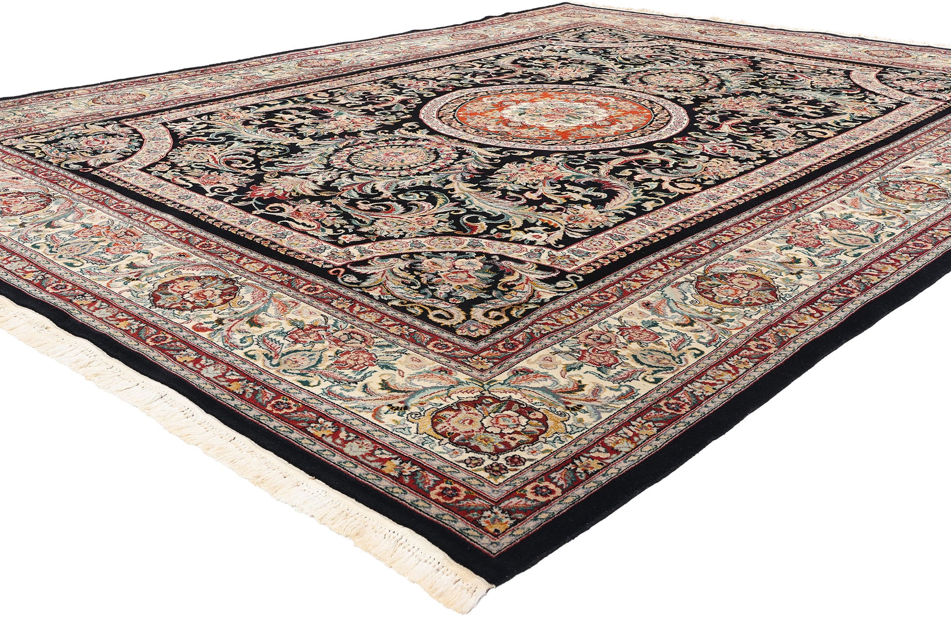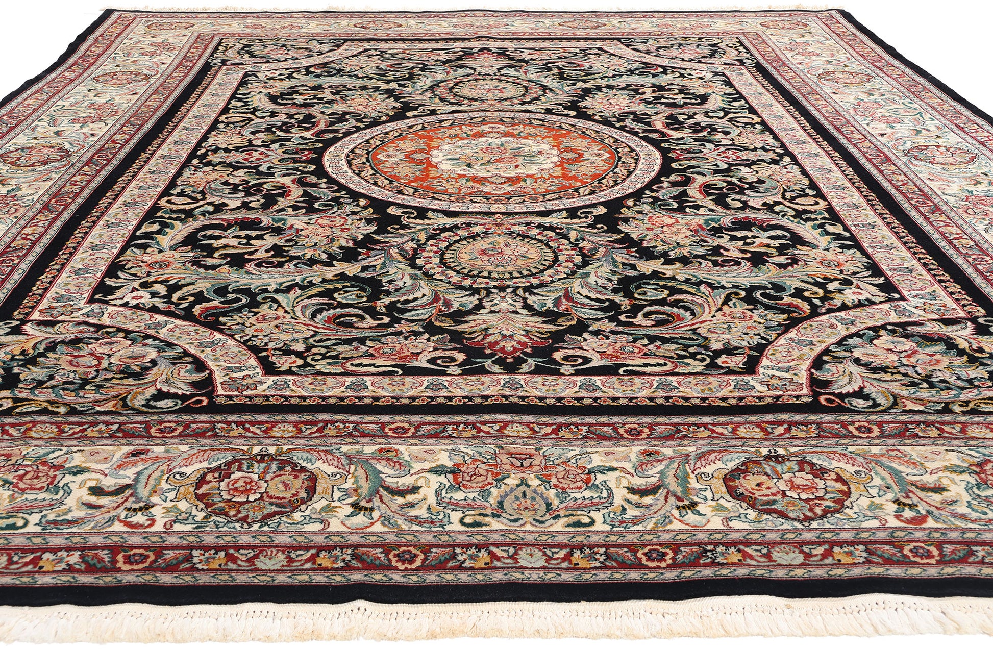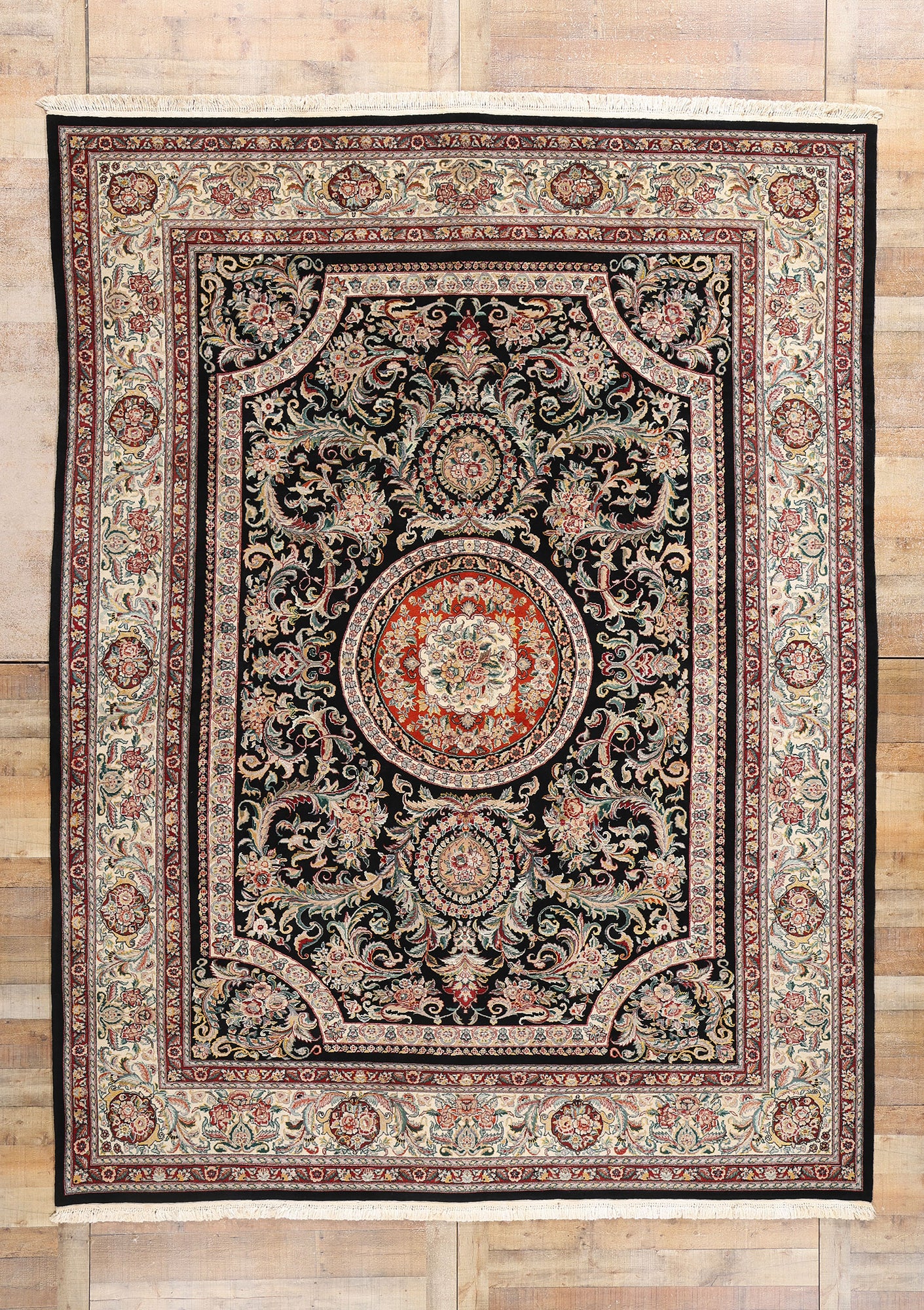 This captivating hand-knotted wool and silk vintage Chinese Savonnerie rug exemplifies an extraordinary fusion of Eastern craftsmanship with European sophistication. This vintage Chinese rug presents an exquisite tableau of ornate design inspired by the French Savonnerie tradition, adapted with masterful Chinese artistry. Its striking black field serves as a dramatic backdrop, amplifying the intricacy of its scrolling acanthus leaves, opulent floral medallions, and curvaceous arabesques, all rendered in a harmonious palette of red, ivory, and green with soft pastel accents.
