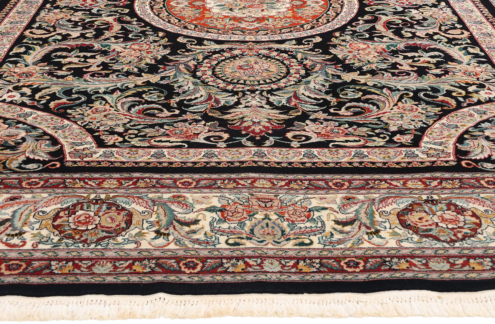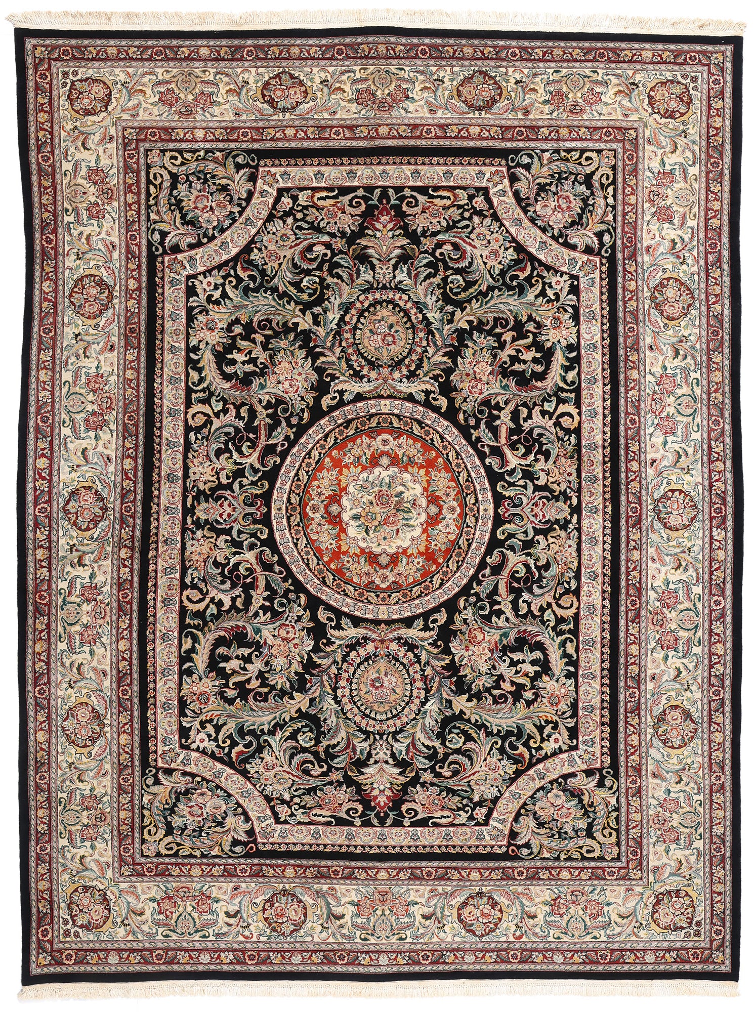 The central medallion is a masterpiece in itself, composed of a vivid crimson core surrounded by floral bouquets that radiate outward, symbolizing vitality and prosperity. Encircling this focal point are meticulously balanced arrangements of intricate vines and stylized flowers, forming an elaborate framework that captivates the eye with its symmetry and depth. The interplay of contrasting colors highlights each motif, creating a mesmerizing sense of movement and refinement throughout the rug's field.