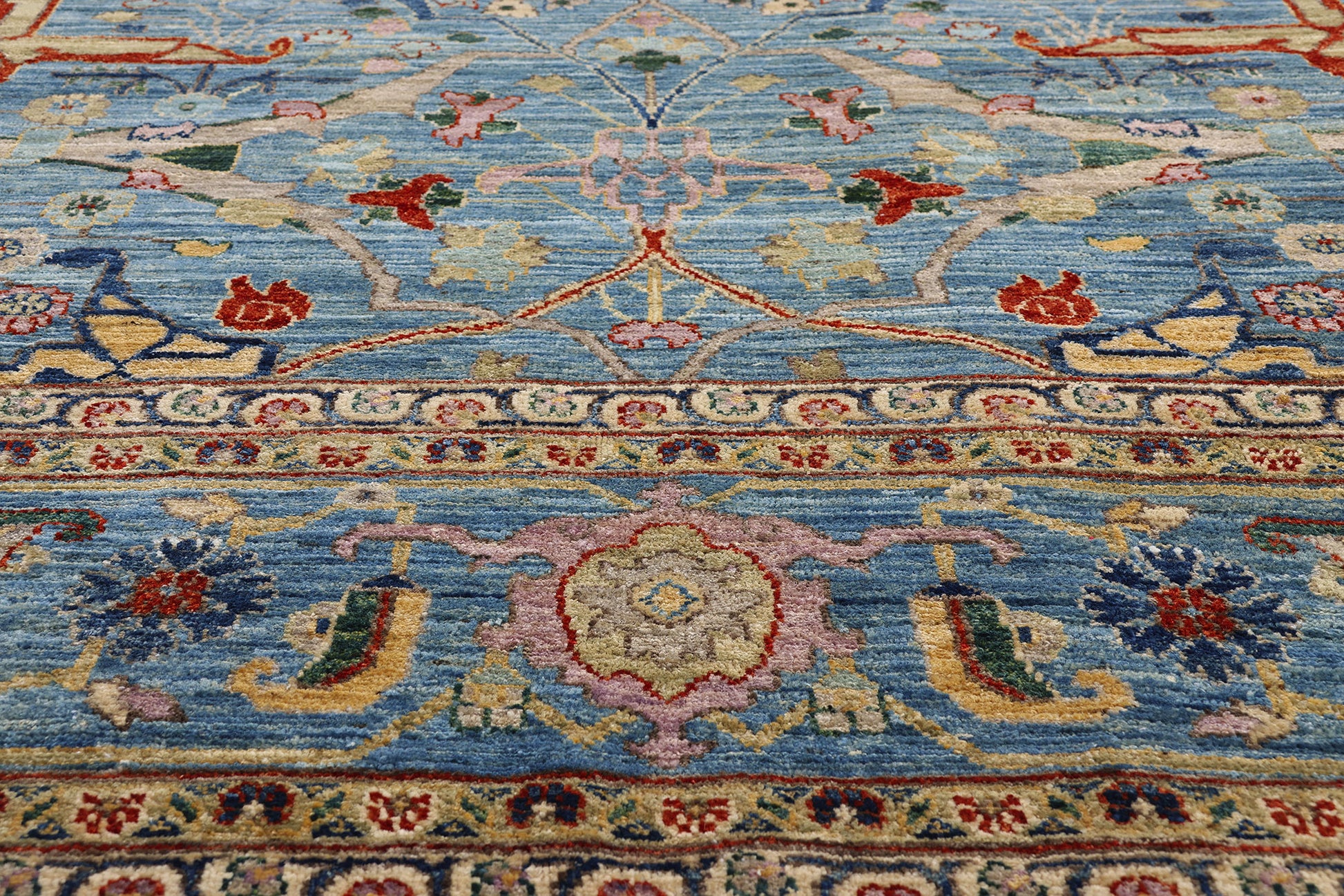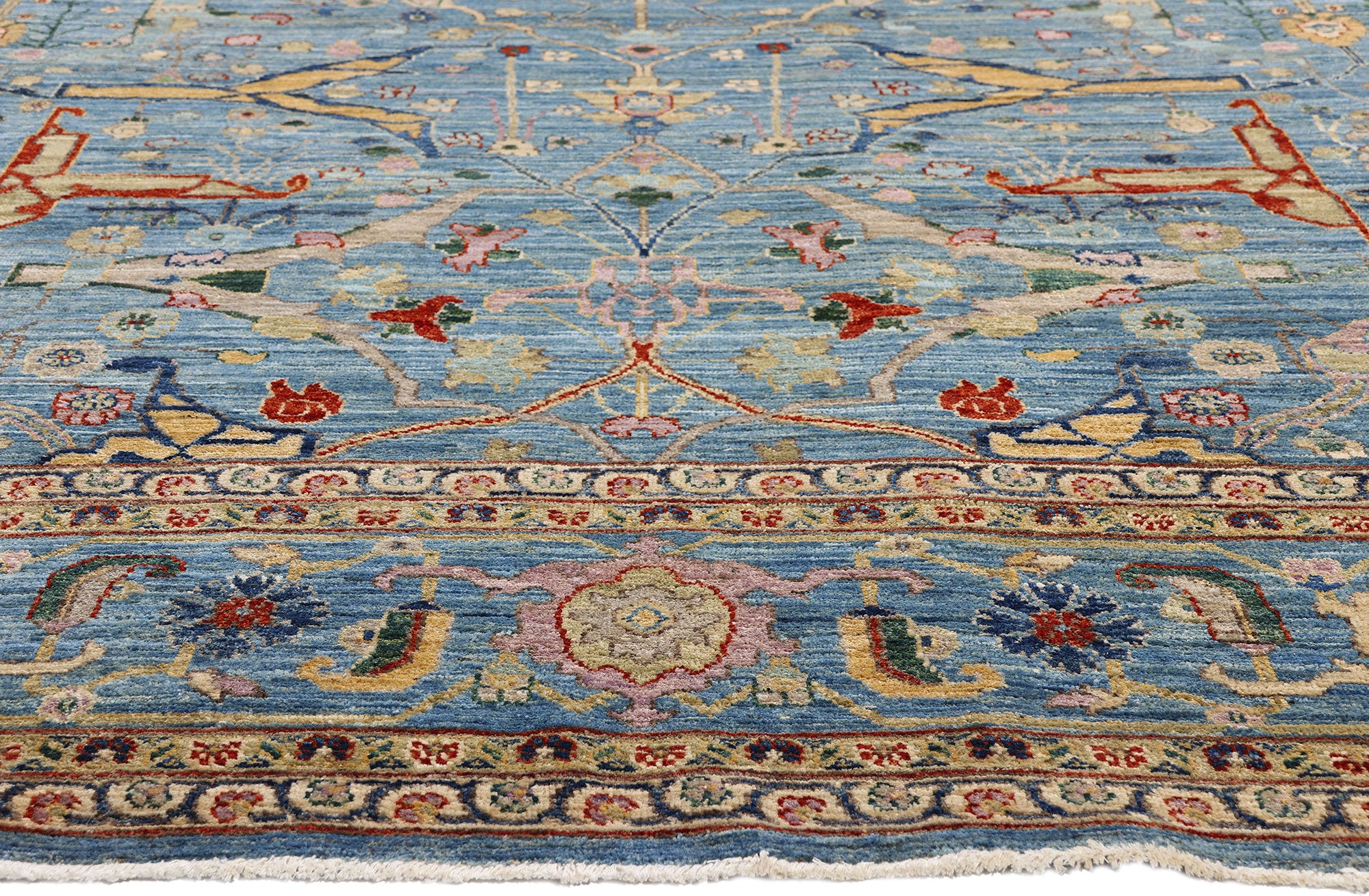 Framing the interior is a robust, multi-layered botanical border that reinforces the rug’s architectural gravitas. Repeating rosettes, palmettes, and curling vinery march in stately procession, offering both visual containment and ornamental flourish. The border’s precise articulation enhances the sense of structure, while its softened palette ensures harmony with the richly detailed field, resulting in a composition that feels both commanding and refined.