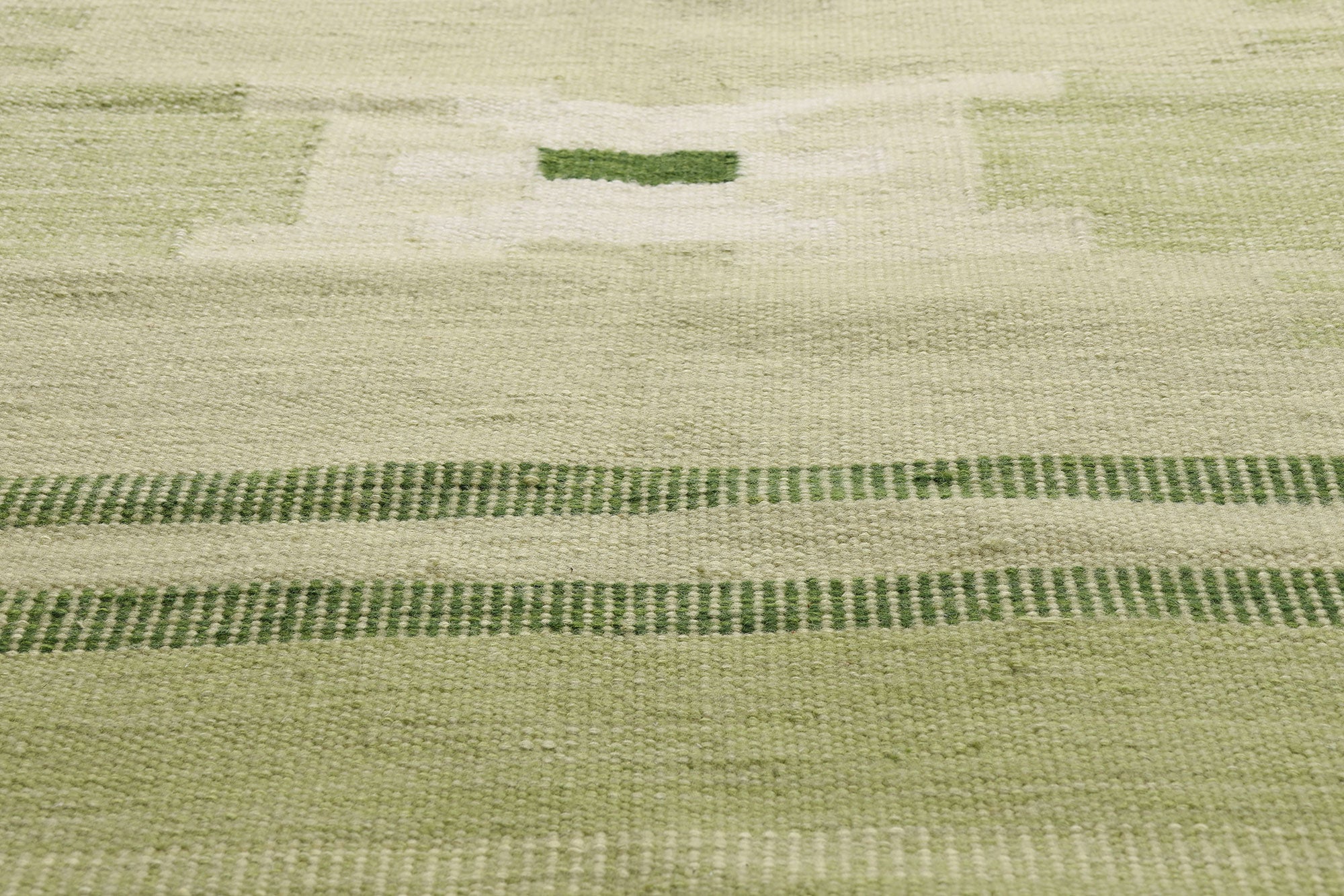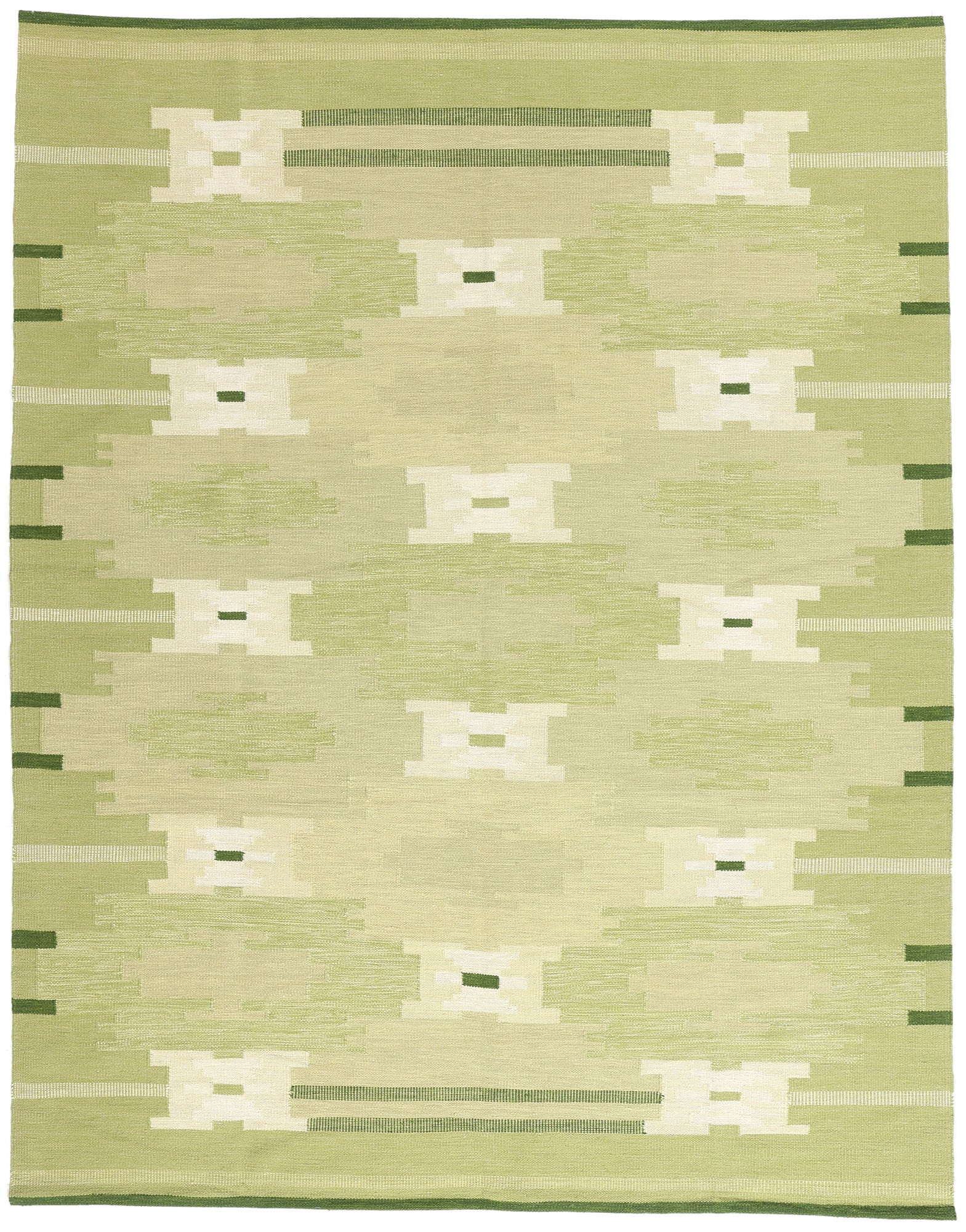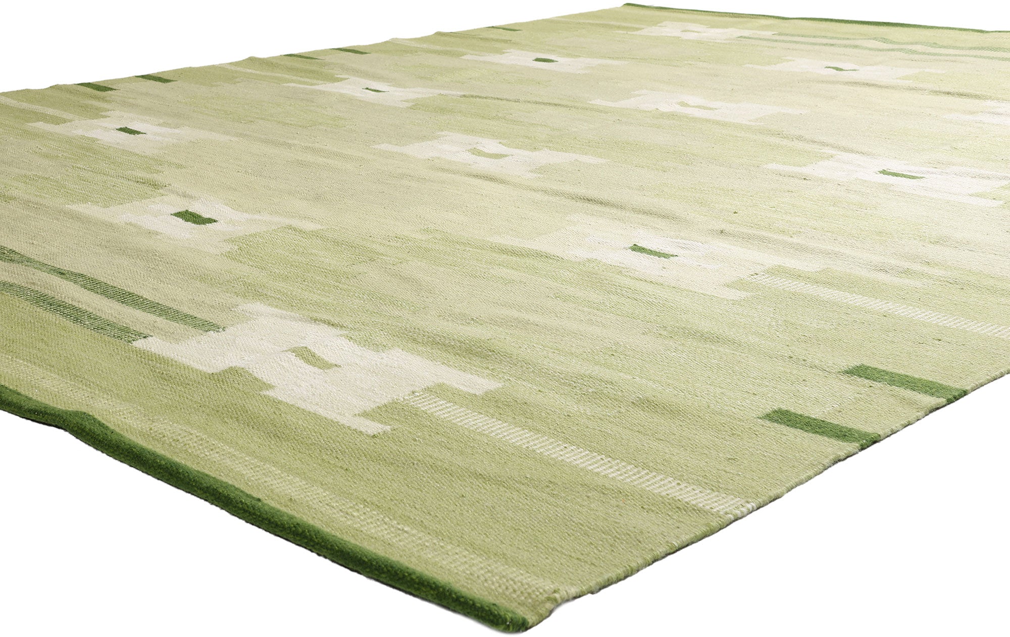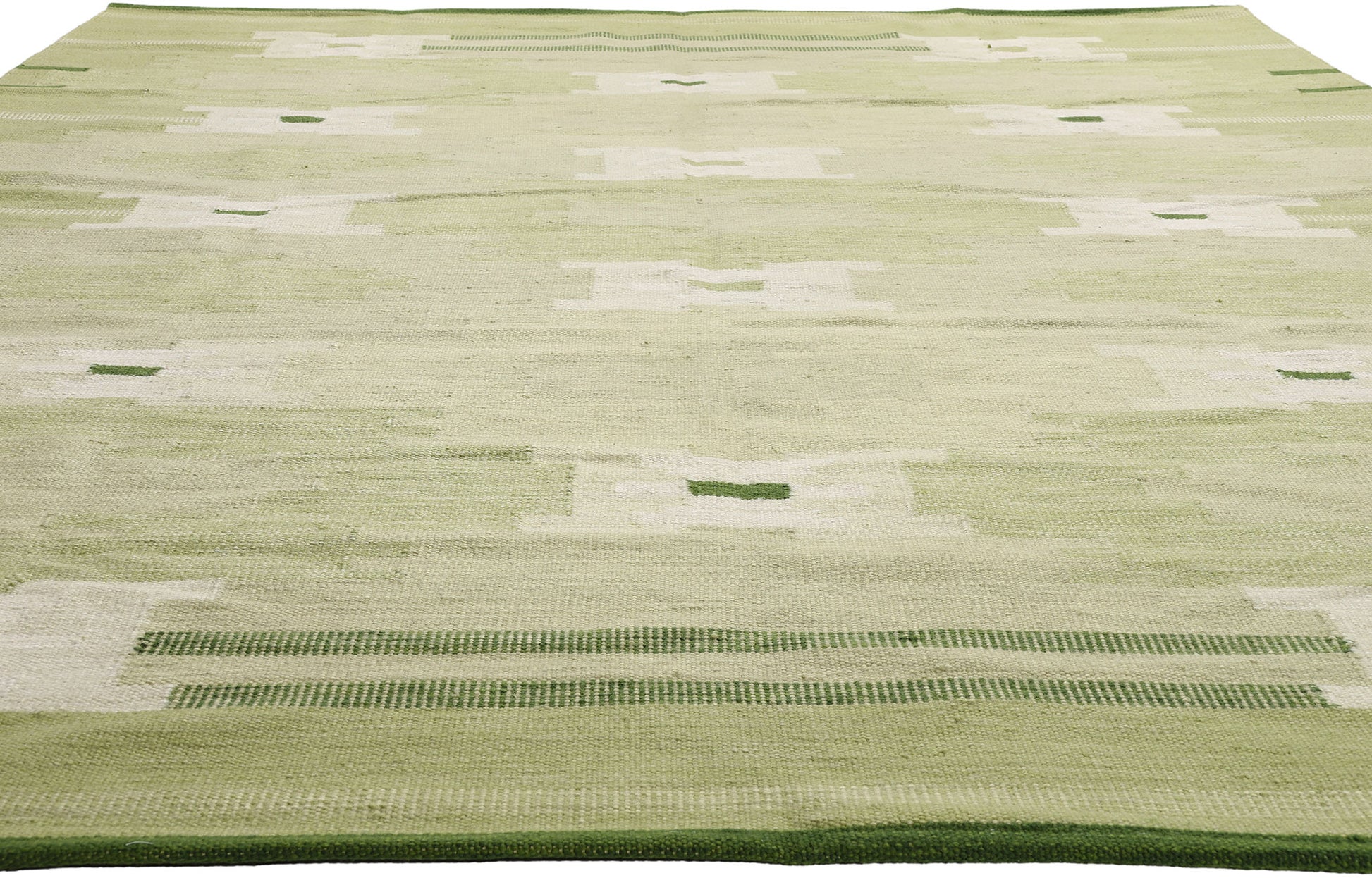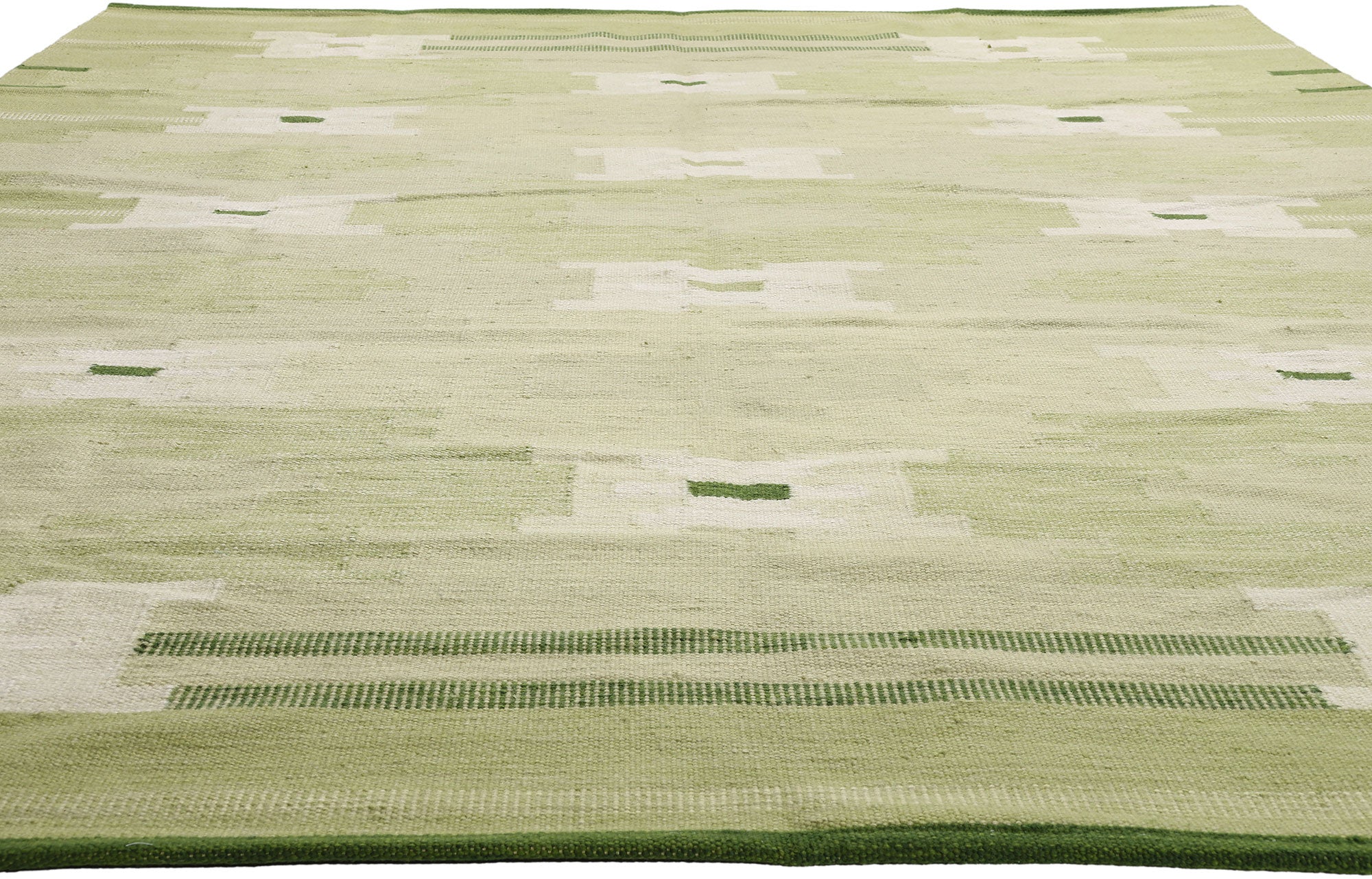Displaying the bold aesthetic of Scandinavian design, this handwoven Swedish-style kilim rug emerges as a captivating embodiment of woven beauty. Its geometric pattern and striking green hues intertwine harmoniously, resulting in a truly distinctive appearance. The composition boasts an allover pattern composed of elongated stepped cross motifs in shades of green, olive, and beige. With its remarkable detail and texture, this flatweave kilim rug strikes a perfect balance between Scandinavian Modern Design and Cubism. Inspired by the works of Ingegerd Silow, this design is affectionately named Gron Timglas Korsmonster, meaning Green Hourglass Cross Pattern.