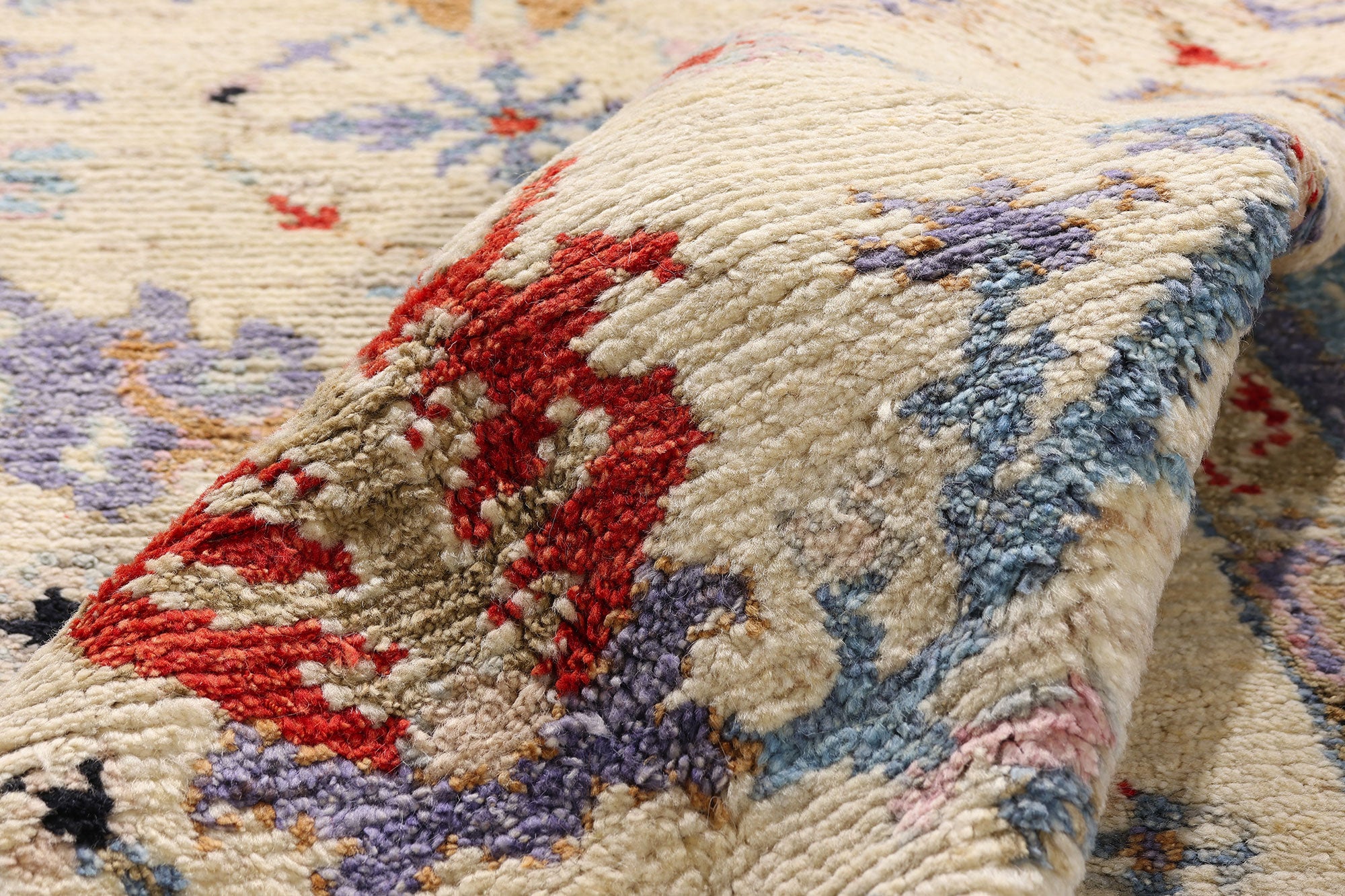 The ivory field, kissed with hues of lavender, celadon, coral, and pale indigo, becomes a living canvas for a dance of stylized florals and floating vinery. The arrangement is deliberately organic, as though nature herself were composing in thread—elegant yet free, poised yet unrestrained. Each blossom and tendril carries the legacy of centuries-old symbolism: tulips for abundance, hyacinths for rebirth, palmettes for divine protection. Their placement—casual, imperfect, almost improvisational—lends the rug a painterly quality, a rare blend of spontaneity and discipline that defines true artistry.