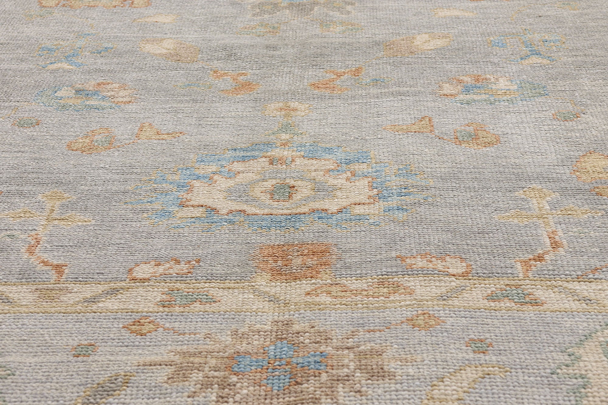 Bathed in a soft dusty blue field, this hand-knotted wool modern Turkish Oushak rug is a vision of restrained elegance and timeless artistry. The palette, softened with subtle abrash, provides a soothing canvas upon which motifs seem to float and breathe. The deliberate color story of blue-gray ground, paired with muted neutrals and hints of warm terra cotta, feels both historic and modern, bridging the worlds of tradition and contemporary luxury.