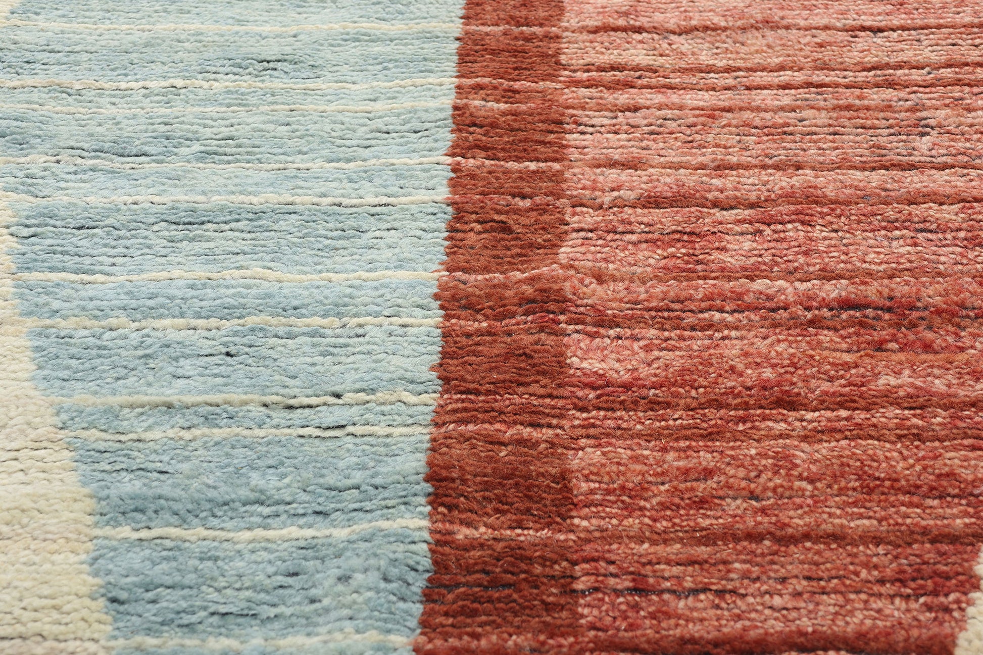 Crafted with meticulous attention to detail, this modern Moroccan style rug features a large-scale tribal pattern that instantly commands attention. The bold, geometric design pays homage to Mid-Century Modern aesthetics while infusing nearly any space with a tribal enchantment and boho chic vibes. Each unique shape is a testament to the rug's craftsmanship, meticulously woven to create a sense of depth and texture. The color palette is a harmonious blend of Mid-Century Modern's subtle tones and the rich, saturated hues of Boho Chic. Soft and neutral earthy tones provide a grounding base, while vibrant pops of color add an eclectic flair, ensuring that this modern tribal Moroccan-style rug becomes the focal point of any room it graces.