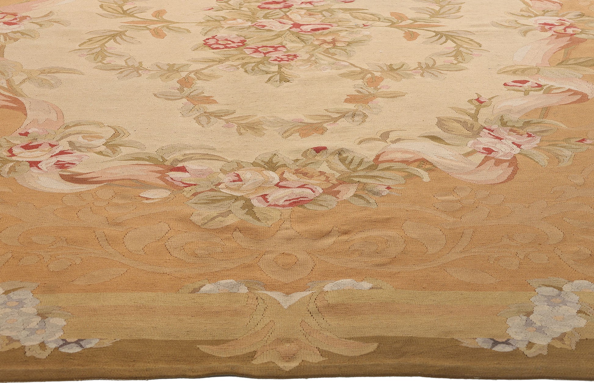 This handwoven wool vintage Chinese Aubusson rug offers a glimpse into a world where artistry and elegance reign. At the heart of its design lies a central medallion that blooms with a lush bouquet of roses and assorted florals, rendered in delicate shades of pink, red, and subtle greens. These elements are intricately enclosed within an expanse of soft golden beige, which serves as a serene backdrop that highlights the vividness of the floral display.