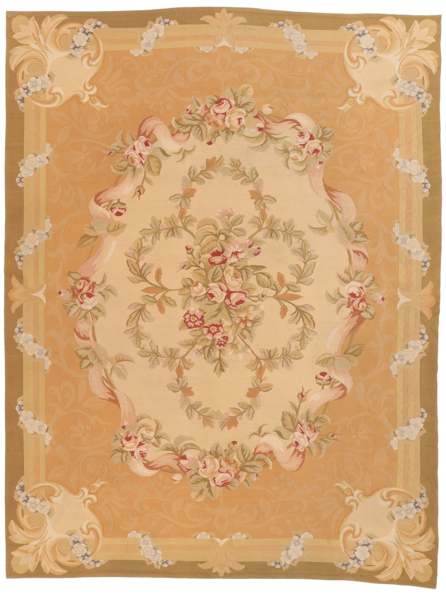 The corners of the rug are adorned with stylized floral arrangements, each echoing the central motif and further embellishing the field. These corner clusters are linked by a luxurious garland of flowers and vines that run along the edges, creating a continuous flow that envelops the entire design in natural beauty. This thoughtful arrangement of elements exemplifies the rug's harmonious blend of nature-inspired themes with the formal aesthetics typical of Aubusson weaves.