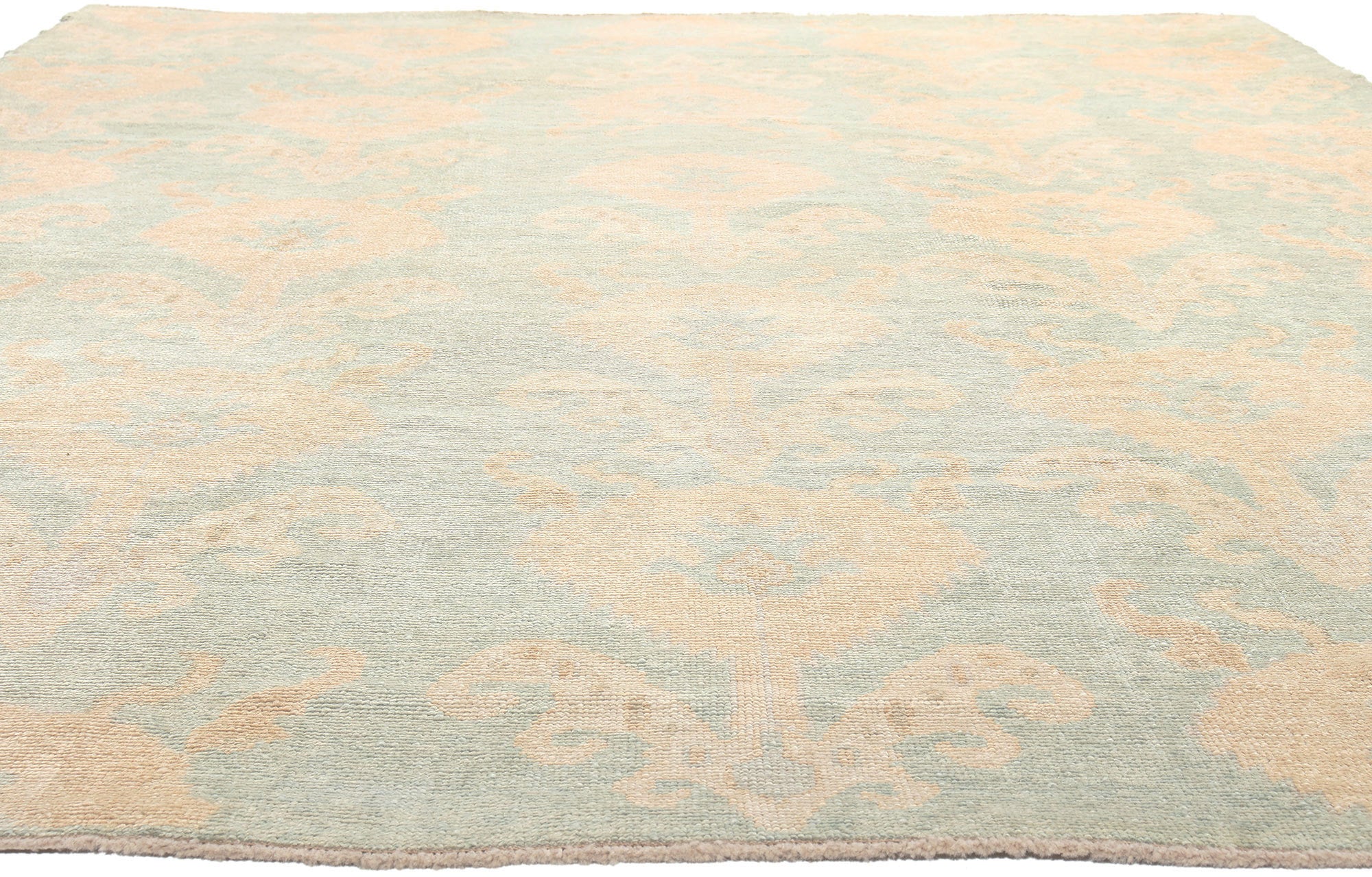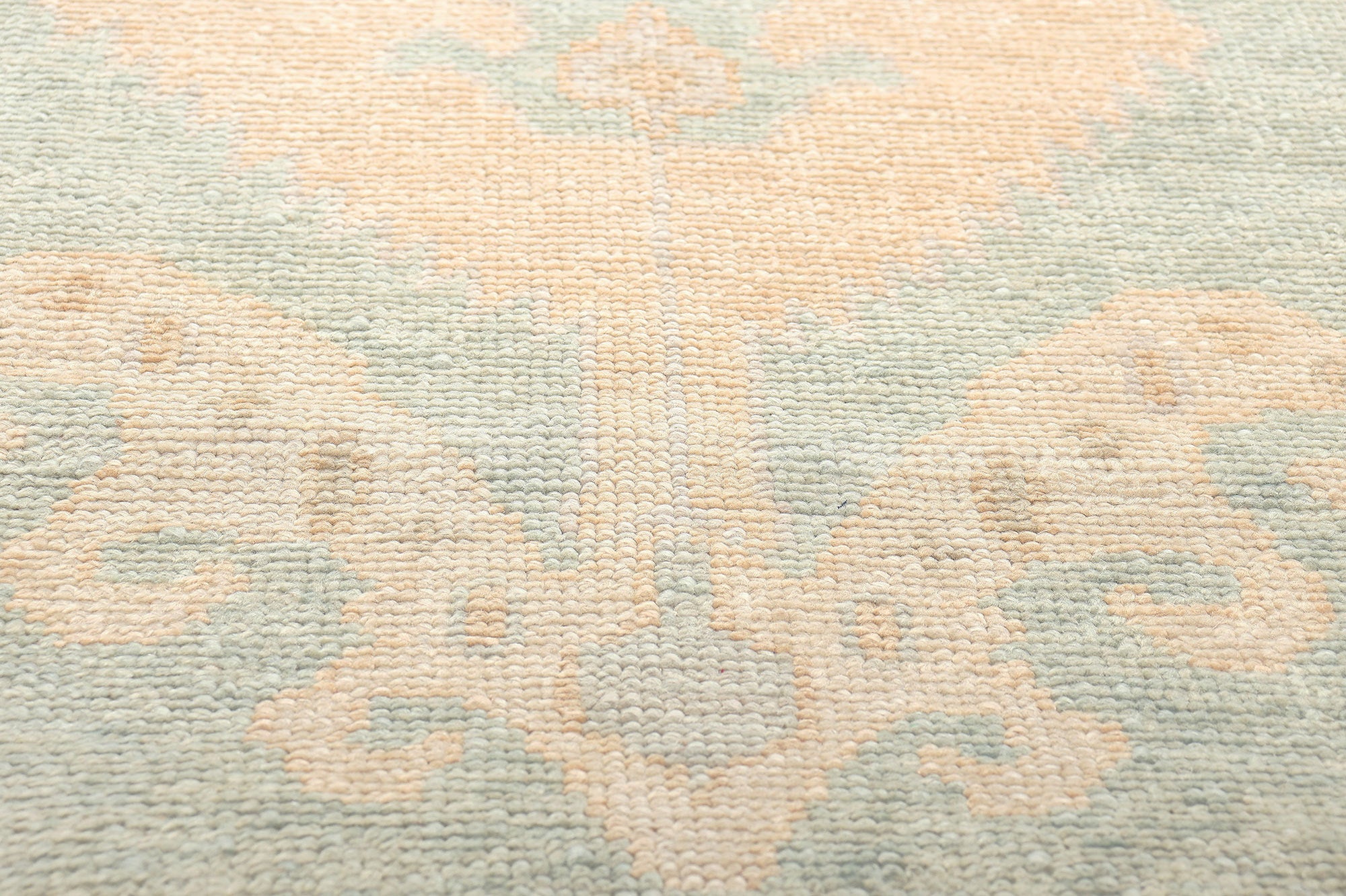 The modern Oushak rug unfolds as a canvas of tranquility, where the pale celadon backdrop serves as a serene stage for the intricate dance of a large-scale allover pattern featuring modern Ikat motifs. These nature-inspired designs, meticulously woven into the fabric, bring a touch of the outdoors indoors, establishing a connection with the natural world.
