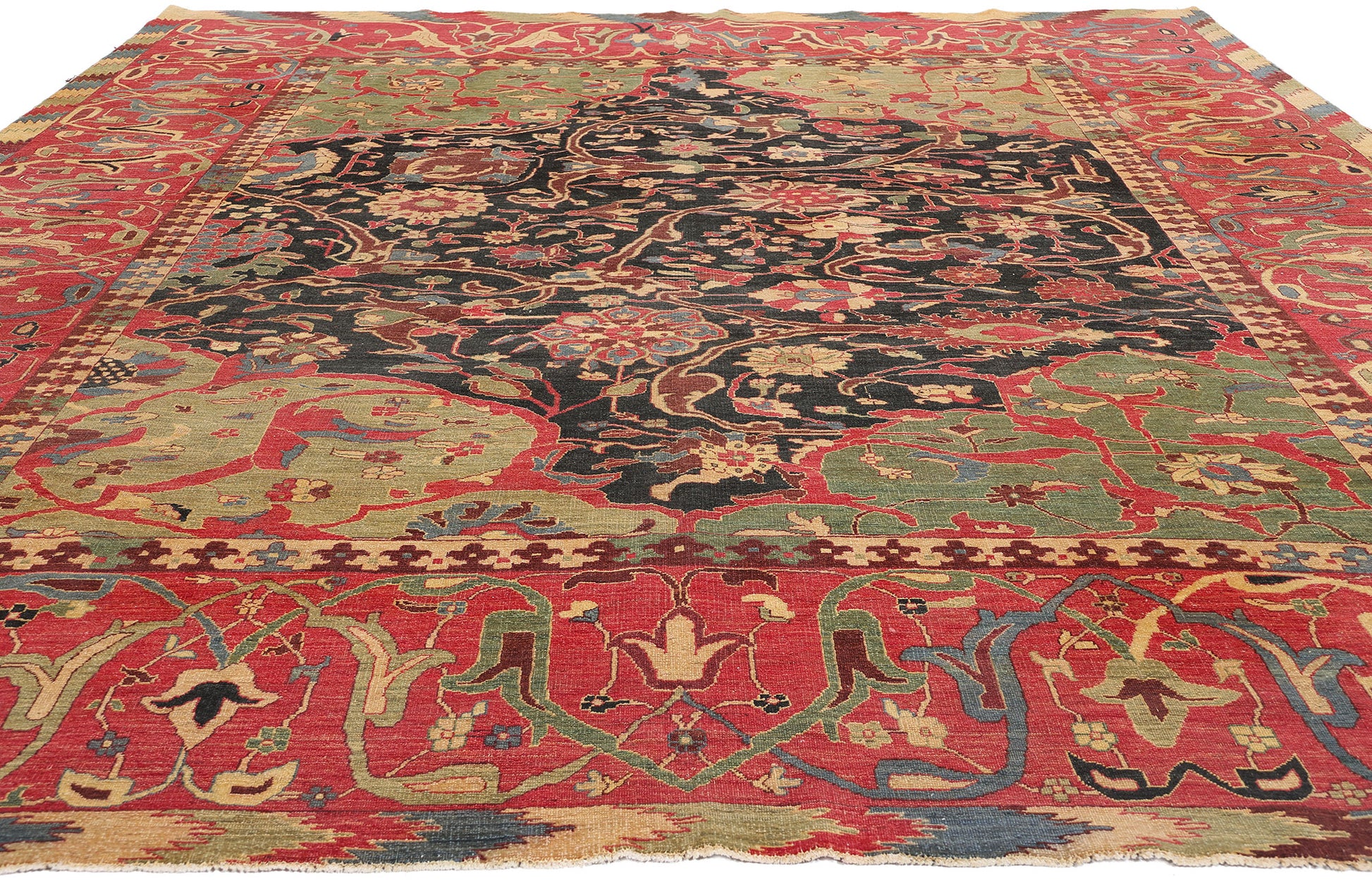 Completing this mesmerizing work is the polychromatic serrated diagonal banded outer guard border, a vibrant element that ties the design together with a spirited flourish. Colorfully curated and packed with visual complexity, this modern Afghan Bijar rug is a celebration of global chic aesthetics. Allow its magic to transport you to an enchanting realm where art and craftsmanship converge in a captivating narrative of beauty and culture.