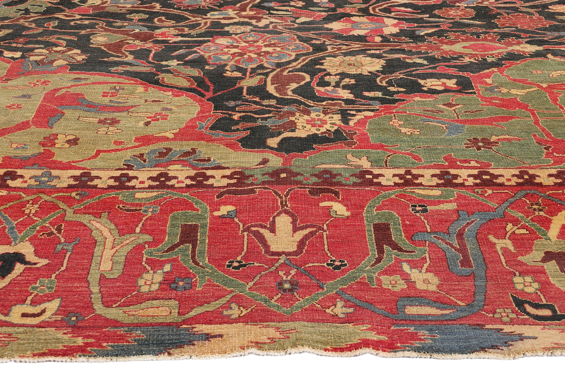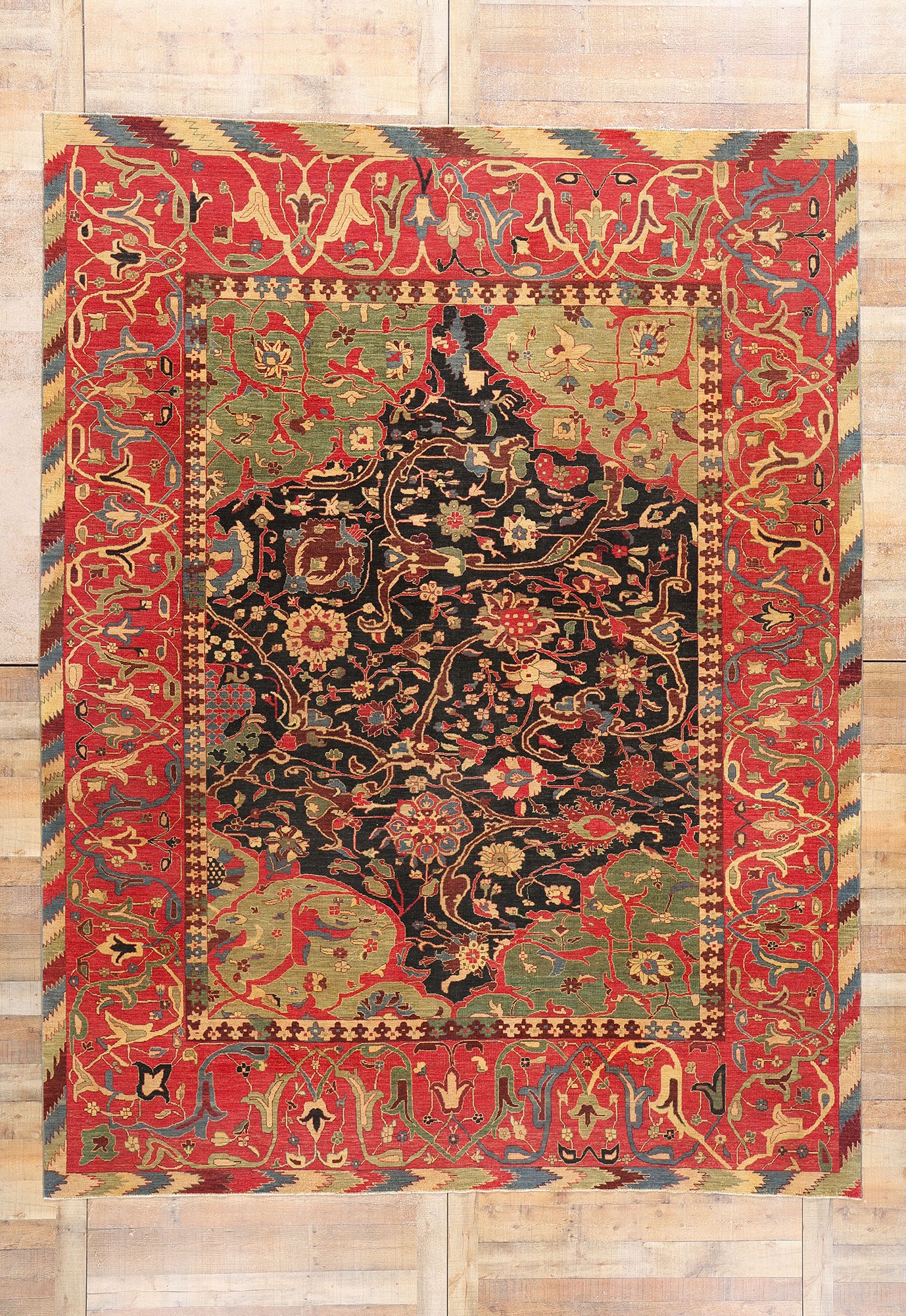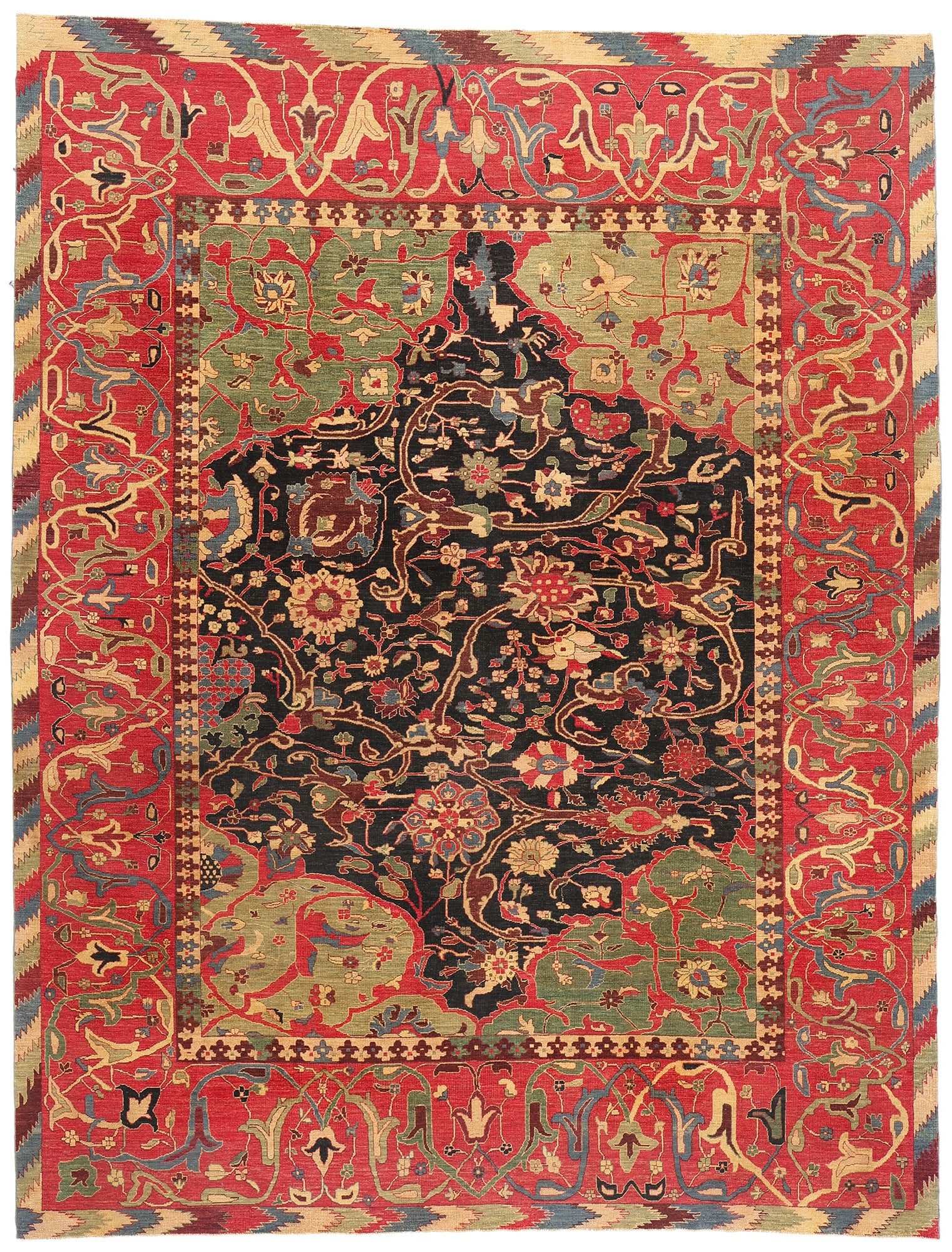 The green corner spandrels offer a refreshing contrast, their botanical elements enhanced by bold red arabesque contours that lend a cosmopolitan flair. This juxtaposition of lush greenery and vibrant crimson highlights the artistic vision that defines this modern rug. Each detail is meticulously rendered, resulting in a composition that radiates sophistication and worldly allure, perfect for elevating nearly any interior to a new level of refinement.