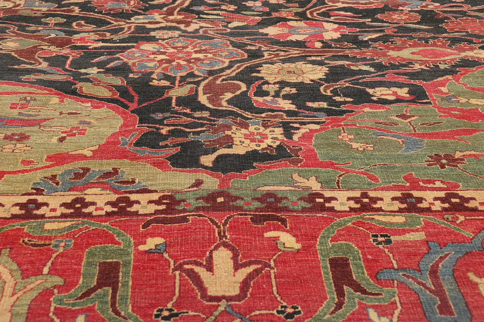 Framing the central field is a crenelated fence guard border, subtly echoing the rhythmic dance of the inner motifs. This delicate feature adds a layer of visual intrigue, balancing the intricate inner design with an architectural refinement. The wide red border, adorned with sweeping arabesques and large-scale floral patterns, acts as a harmonious counterpoint, imbuing the Afghan Bijar rug with a bold yet graceful presence.