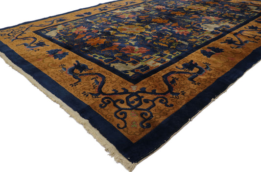 Our collection of Chinese carpets embodies the rich East Asian heritage, blending haute deco with Old World style. Infuse opulent colors into your space and add a touch of the unexpected with our vintage Chinese rugs. Steeped in folklore, culture, and history, our antique Chinese carpets for collectors reflect religious and philosophical elements, incorporating images and designs symbolizing the fascinating land of China. Find lotus blossoms, Kuilong dragons, nature scenes, clouds, birds, and assorted ornamental objects in these Chinese rugs for sale. Considered highly collectible in today's market, authentic Chinese rugs online are sought after by high-end interior designers, architects, rug enthusiasts, museums, and hospitality businesses that wish to make an impeccable impression on visitors.