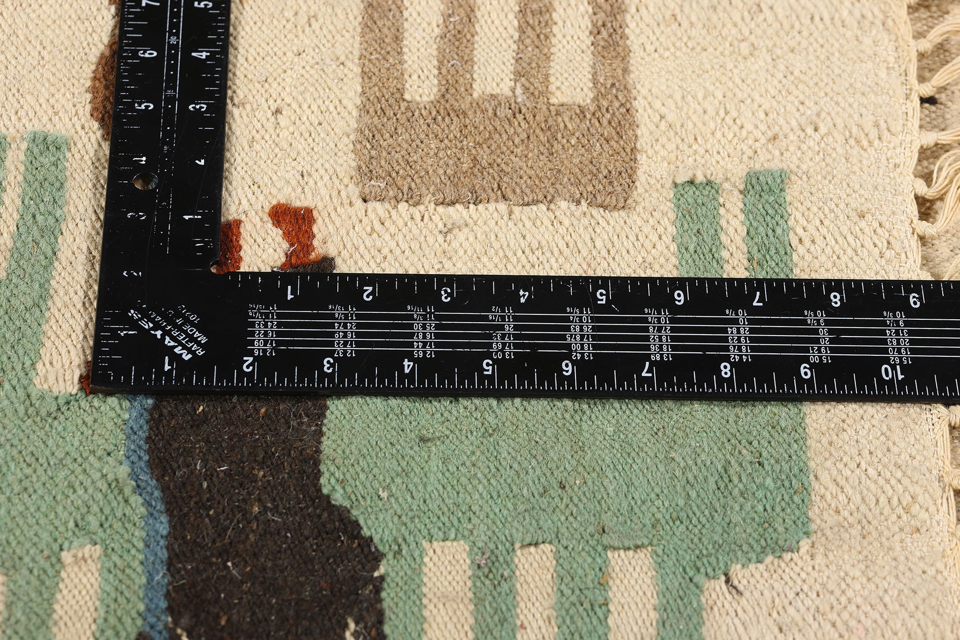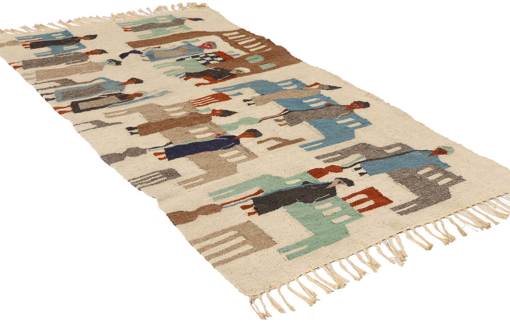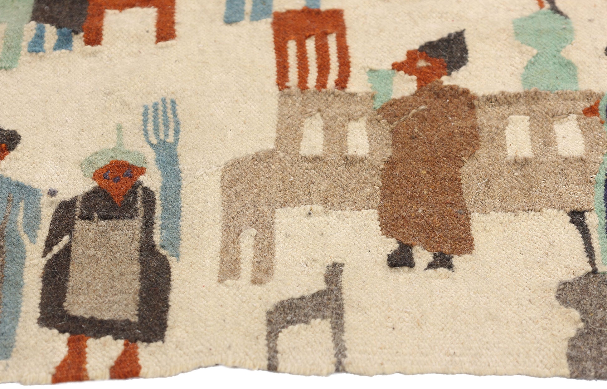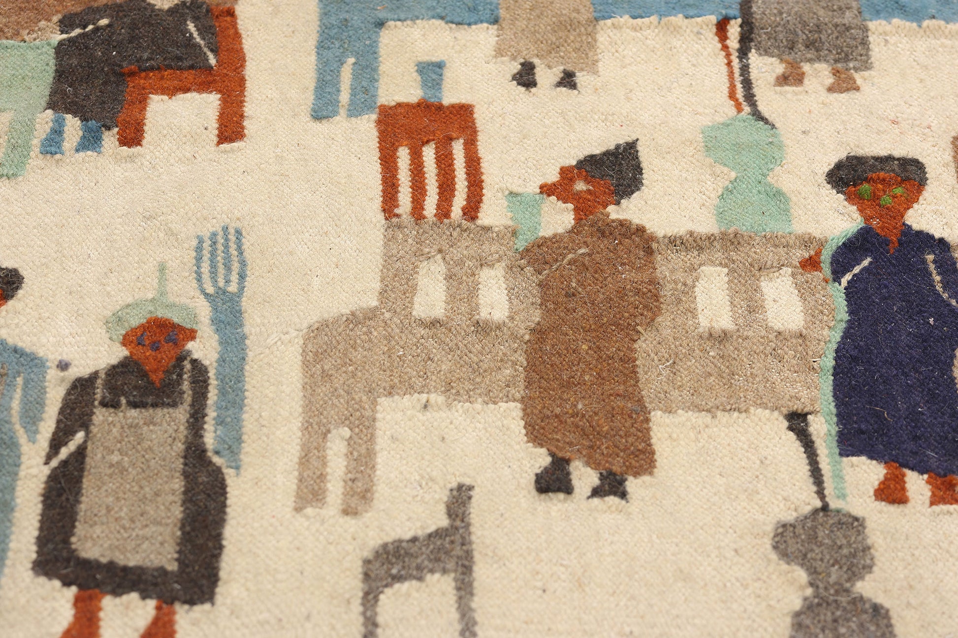 Crafted in the mid-20th century, this pictorial tapestry is an excellent example of traditional Egyptian weaving techniques that have been passed down through generations. The wool is finely spun, and the weaving is tight and intricate, indicating the work of a skilled artisan. This period was marked by a revival and appreciation of indigenous crafts in Egypt, fueled by a growing national consciousness and a desire to preserve cultural heritage amidst modernization. The Egyptian kilim rug’s design reflects this ethos, celebrating everyday life and the communal spirit that is a cornerstone of Egypt's culture.