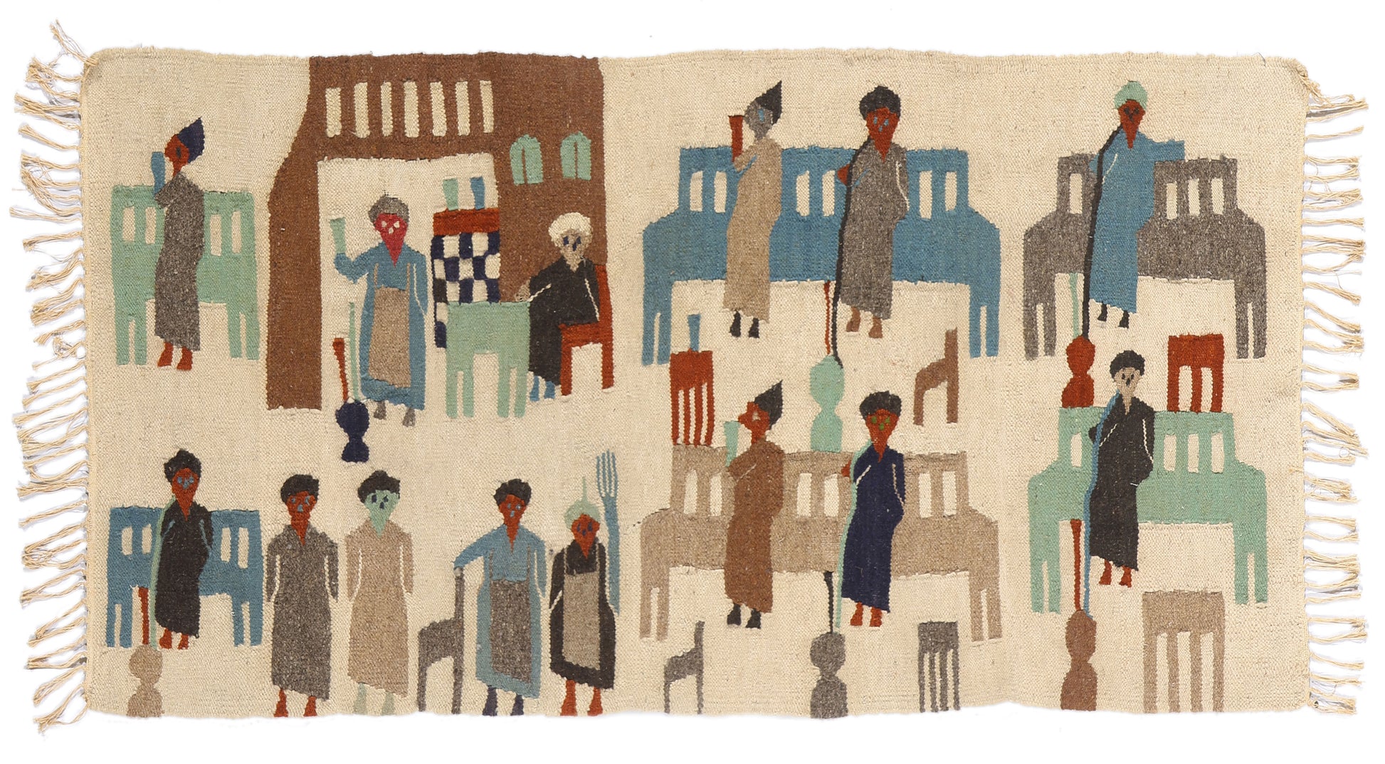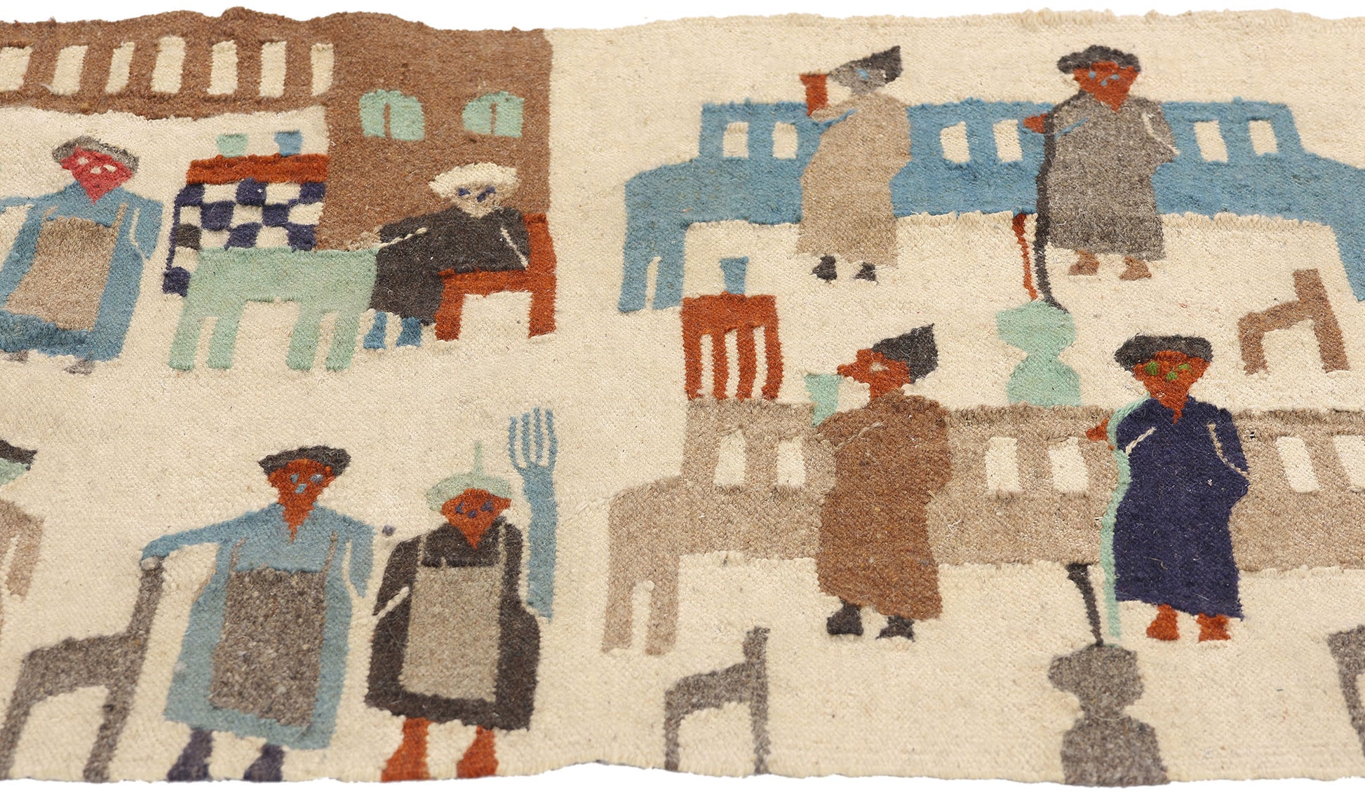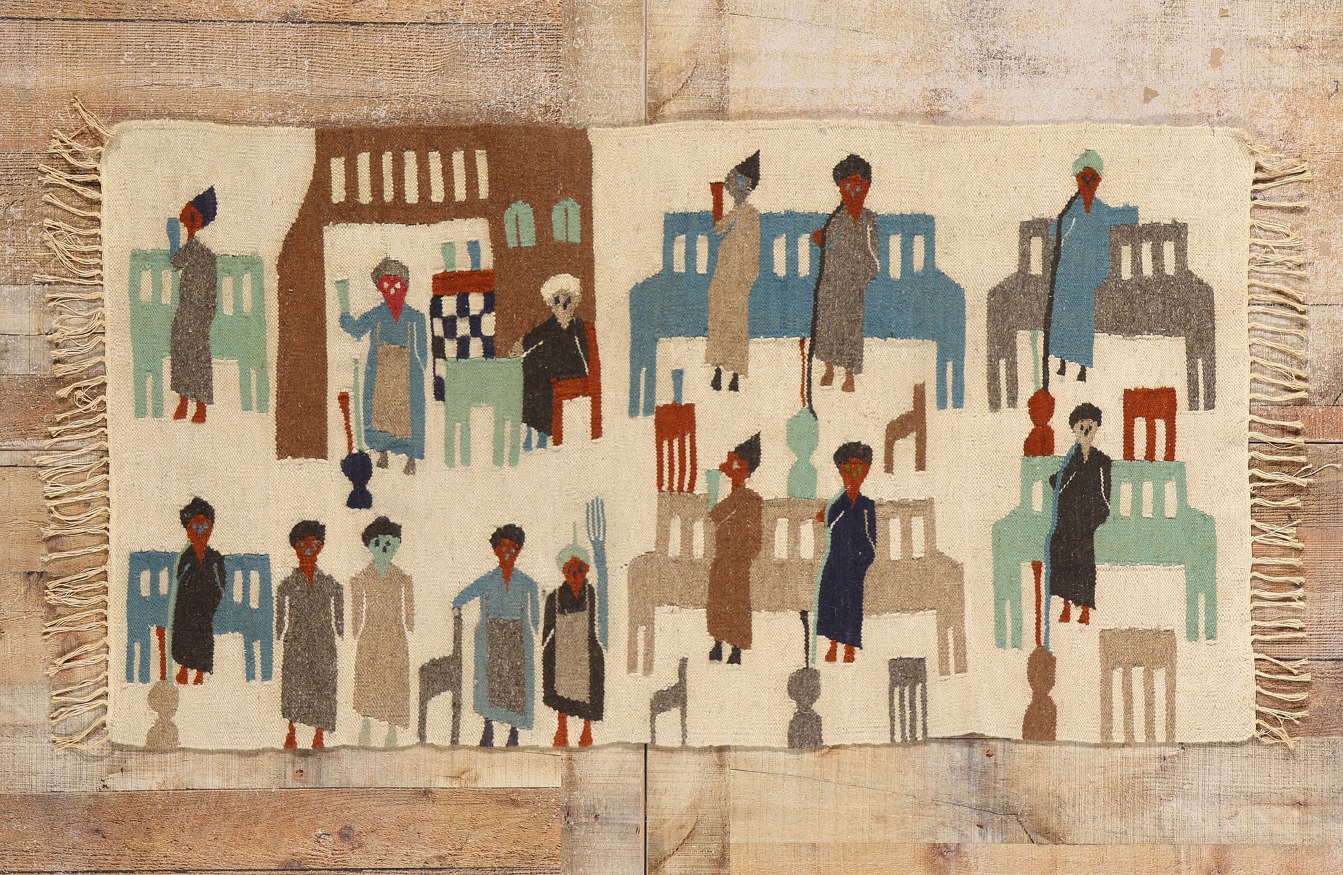 This captivating handwoven wool Egyptian pictorial tapestry is a vibrant artifact of cultural life in Egypt, depicting an animated urban scene that bursts with character and color. The Egyptian tapestry showcases a series of figures, possibly townspeople, engaged in various daily activities, set against a backdrop of stylized architectural elements that suggest a bustling market or a lively neighborhood. Each figure is uniquely portrayed, with distinct attire and postures that convey a sense of individuality and community life. The color palette is earthy and muted, typical of natural dyes, with occasional splashes of brighter colors that bring vibrancy and a sense of realism to the tableau.