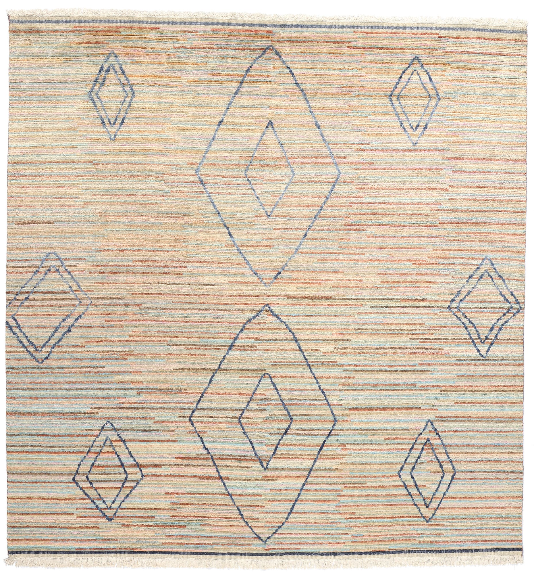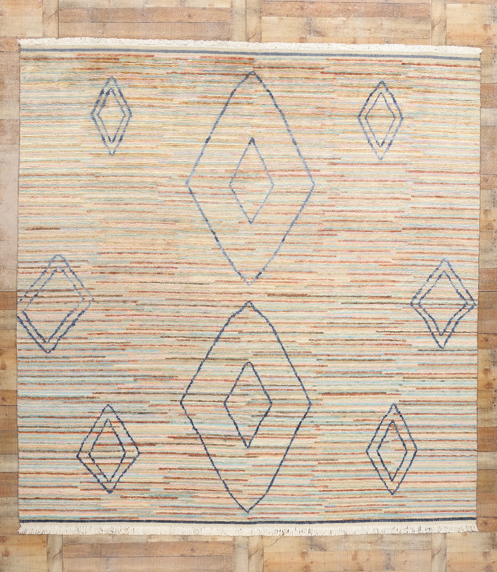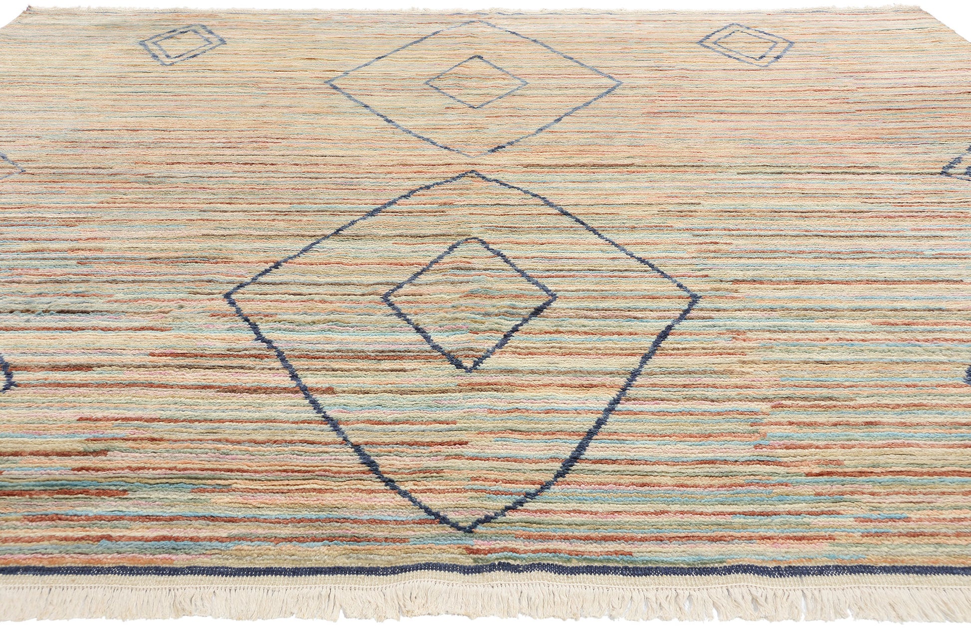 This Moroccan area rug is a celebration of bohemian elegance, where simplicity and detail coexist in perfect balance. The striking blue diamond outlines, seemingly floating above the striped background, add a layer of intrigue and depth to the design. These geometric patterns and lozenge motifs are a nod to traditional Moroccan symbols, reinterpreted in a modern context to appeal to contemporary tastes. The diamonds and concentric lozenges are carefully placed to guide the eye across the rug, creating a sense of movement that is both dynamic and soothing.