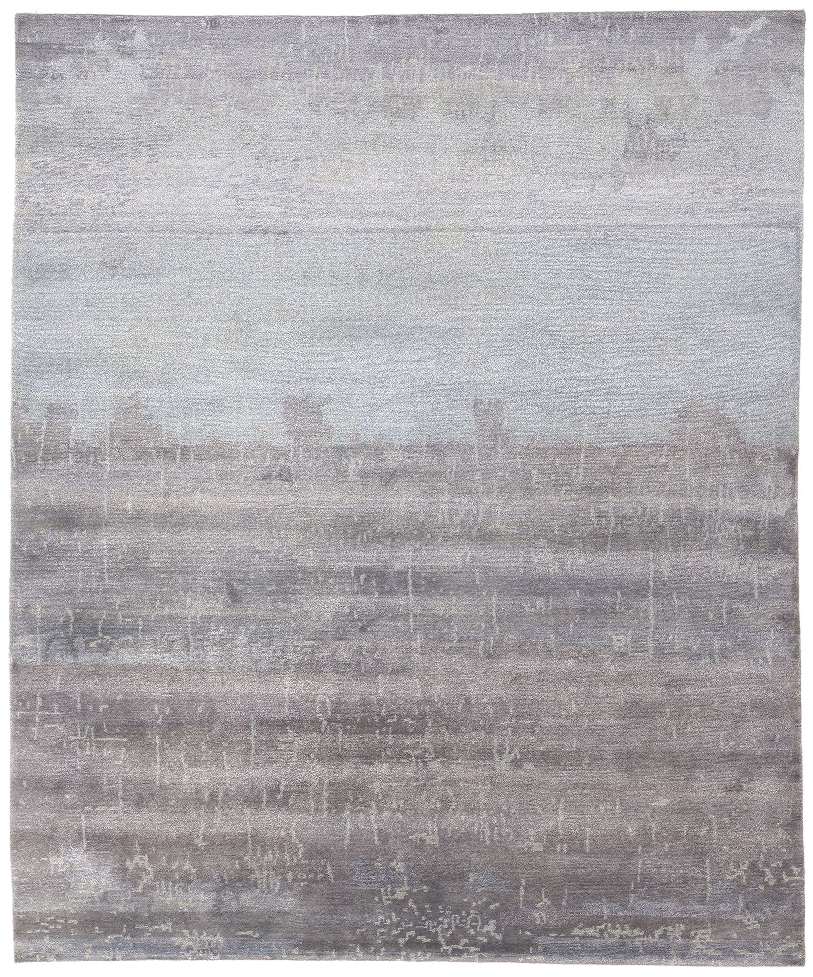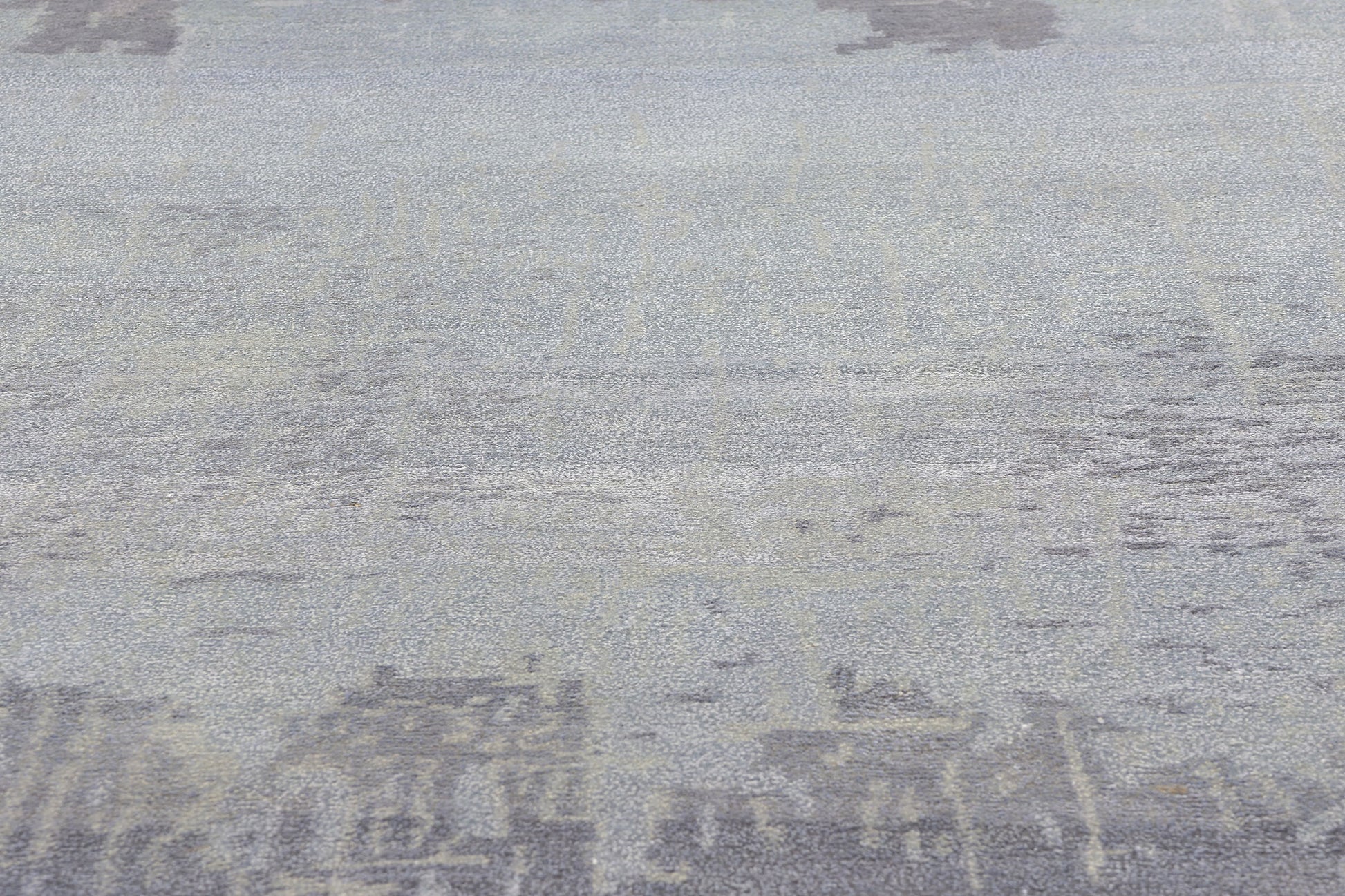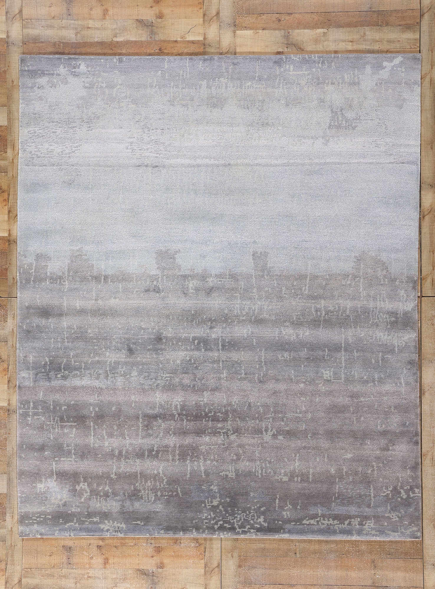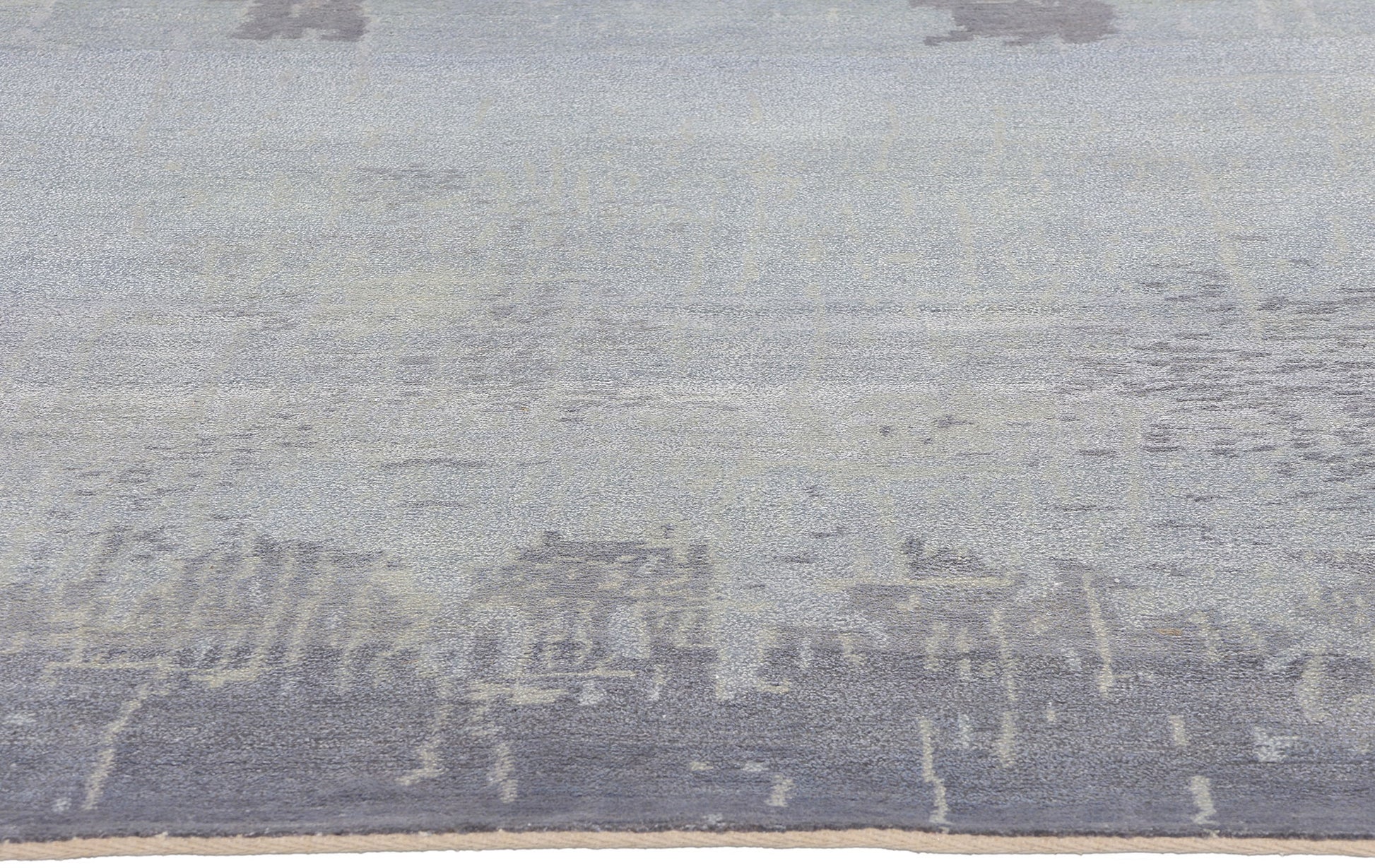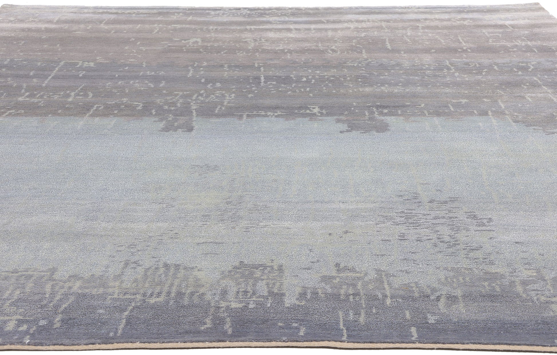 This hand knotted wool Moonlit Tranquility Contemporary Abstract Rug is an Indian masterpiece that exudes a sense of serene calm and understated elegance. Crafted from fine wool, this contemporary area rug features an exquisite abstract design reminiscent of a tranquil landscape bathed in the soft glow of moonlight. Its delicate gradient transitions from misty grays to gentle blues, evoking a peaceful night sky over a calm, reflective sea. Each fiber reflects a subtle shimmer, capturing the essence of moonbeams dancing on the surface of still waters.