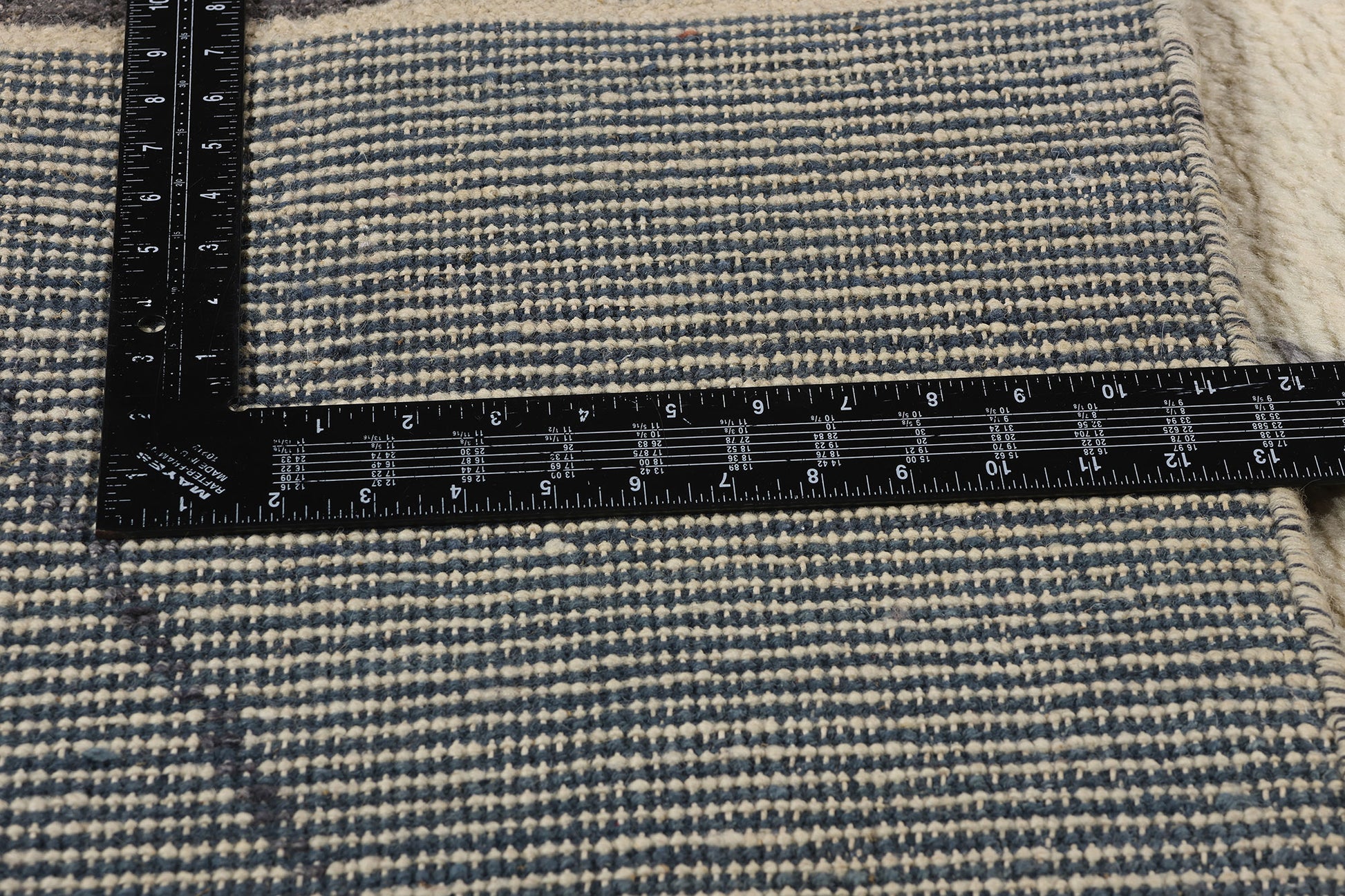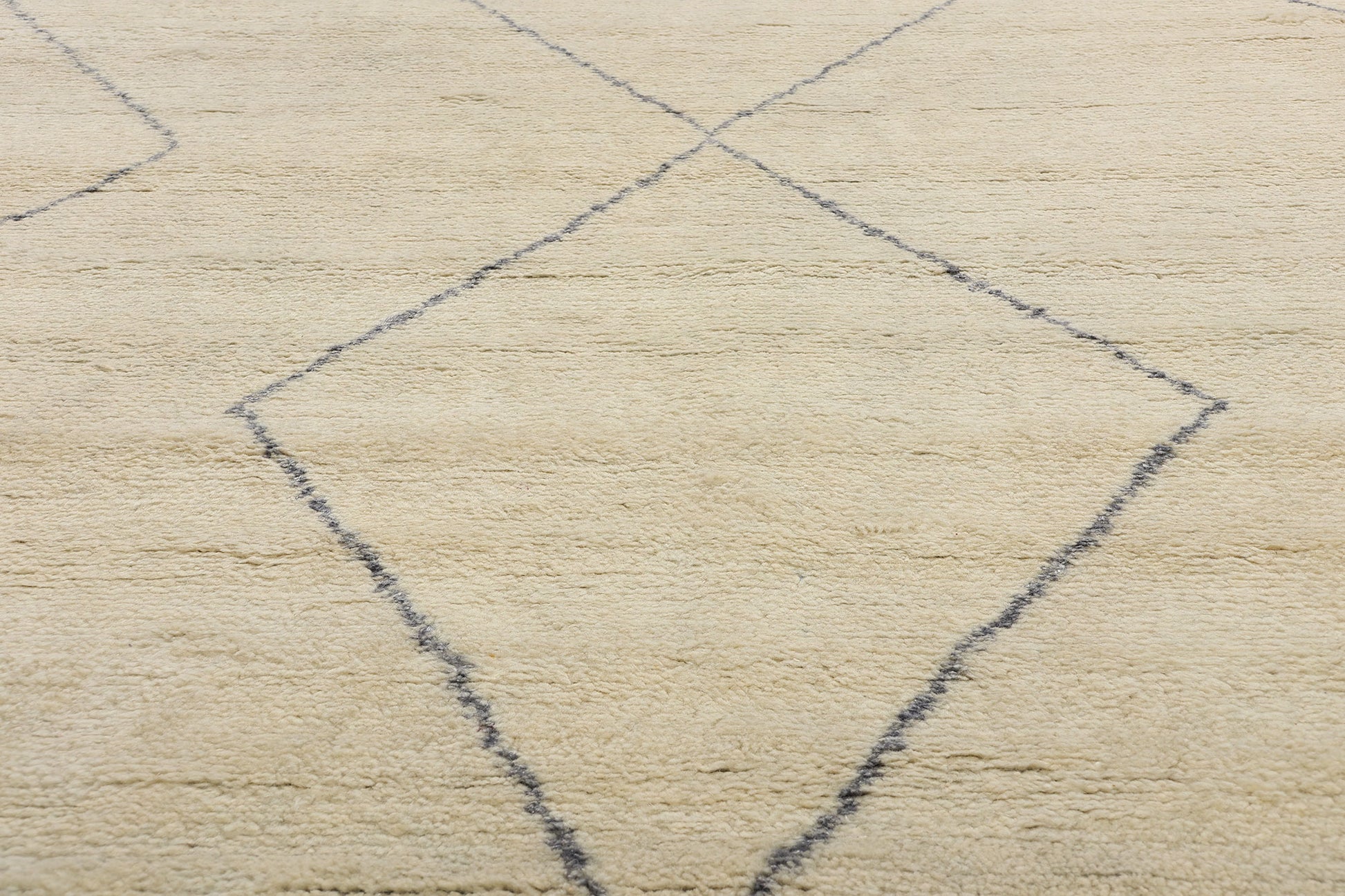 Hand-knotted with the utmost care, this Moroccan area rug is crafted from luxurious wool, ensuring both durability and softness underfoot. Its textured surface invites touch, while the carefully chosen navy blue lines create a striking contrast against the neutral background, capturing the eye without overwhelming the senses. This combination of color and texture reflects a perfect balance between contemporary design principles and time-honored weaving techniques.