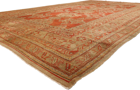 During the 18th and early 19th centuries, Oushak rug weaving declined, only to re-emerge in the 1900s when the Oushak area became the focal point of Turkish rug-making. Oushak rugs made after 1900 are primarily decorative, room-sized rugs featuring stunning medallion designs and intricate patterns that incorporate scatterings of palmettes and vine scrolls, as well as smaller images of bold medallions. Our antique Oushak rugs for sale will dynamically transform any room from nondescript to unforgettable with their quietly intense palettes, detailed motifs, and lustrous wool.