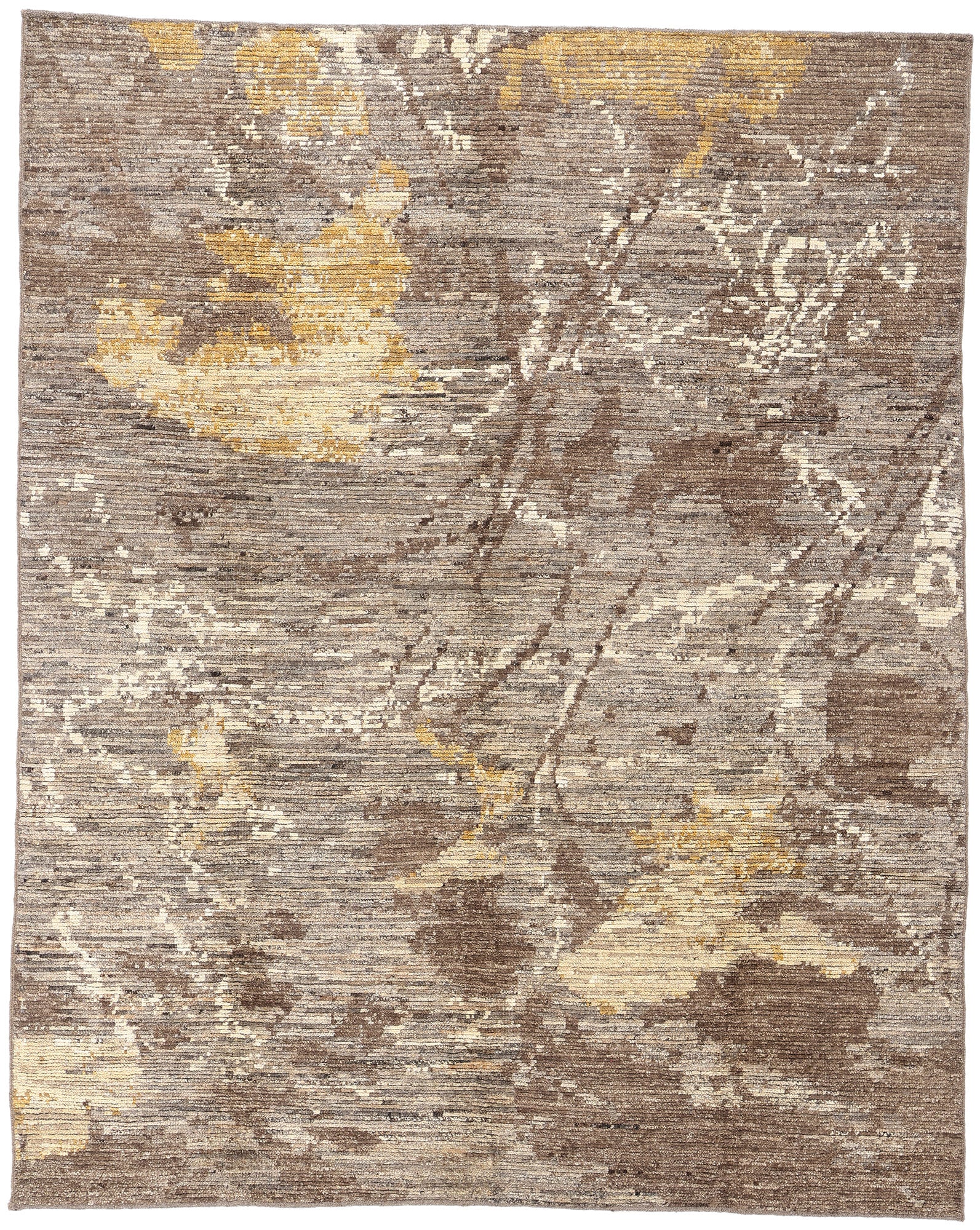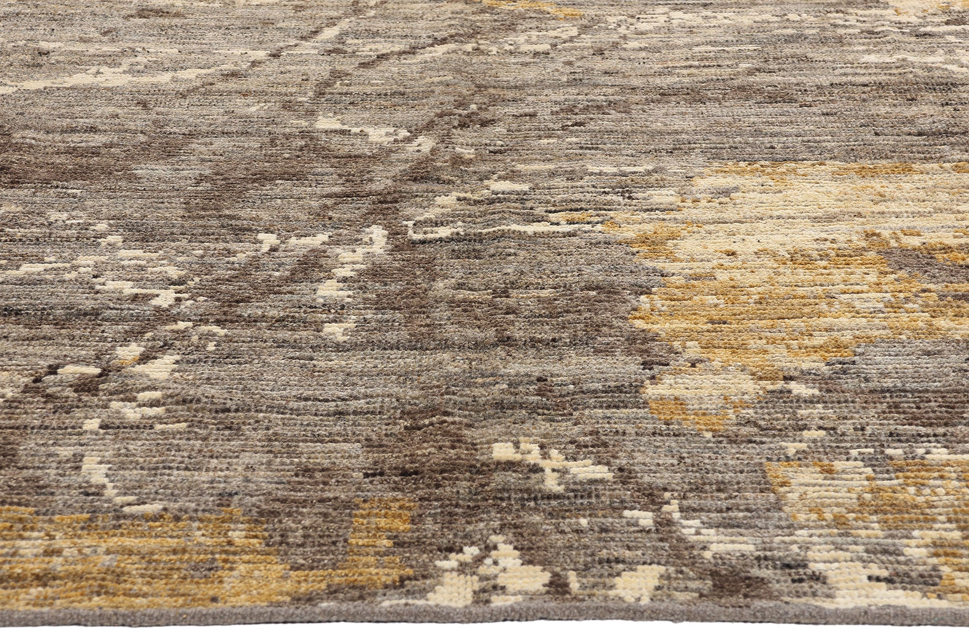 This hand-knotted wool Organic Modern Moroccan rug, infused with Biophilic Design principles, draws inspiration from the natural world, creating a serene and harmonious connection to the environment. The Moroccan rug’s soft earth tones, ranging from warm browns to subtle yellows and creamy beige, reflect the organic textures and hues found in nature. The abstract design evokes the fluidity of flowing water and the soft patterns of leaves and branches, offering a sense of calm and balance that echoes the tranquil beauty of the outdoors.