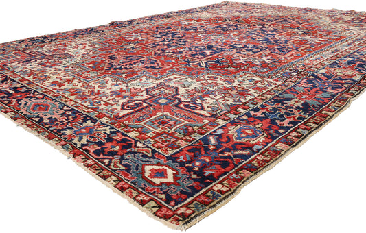 A Persian Heriz carpet is a handwoven masterpiece originating from the northwest region of Iran. These rugs are characterized by their rectilinear design, large geometric medallion, tribal motifs, warm colors, and intricate Herati border.