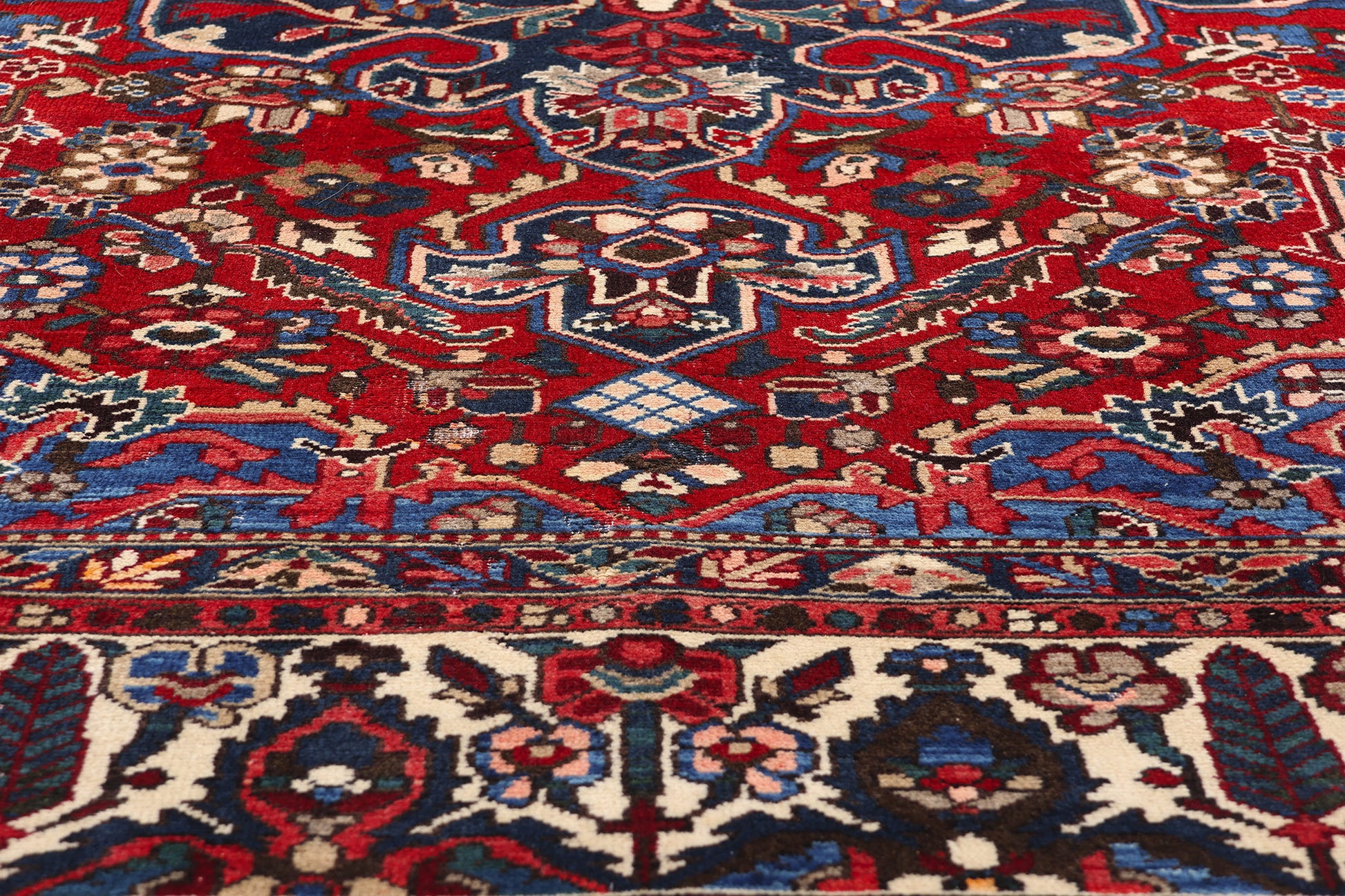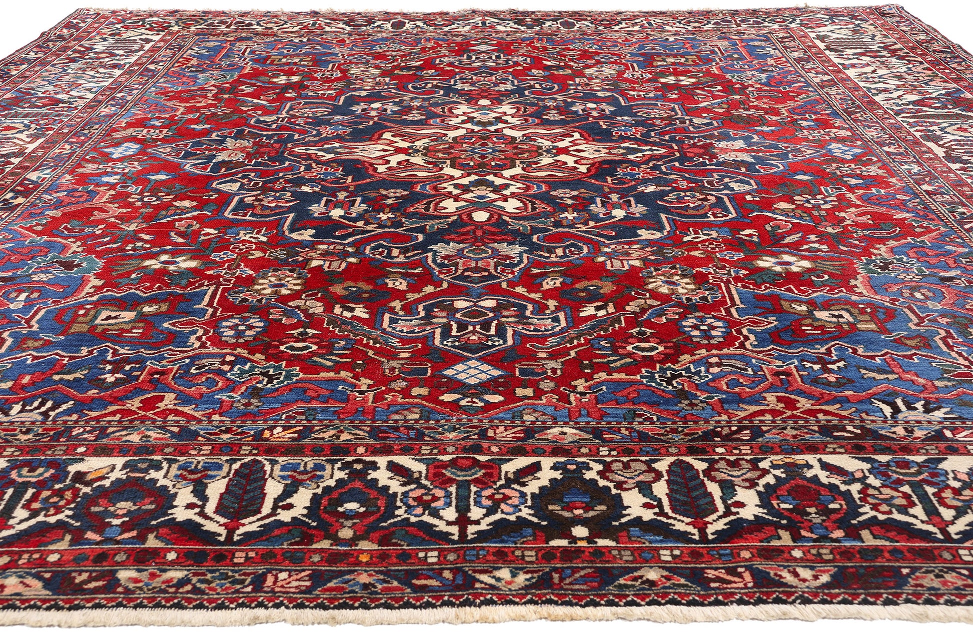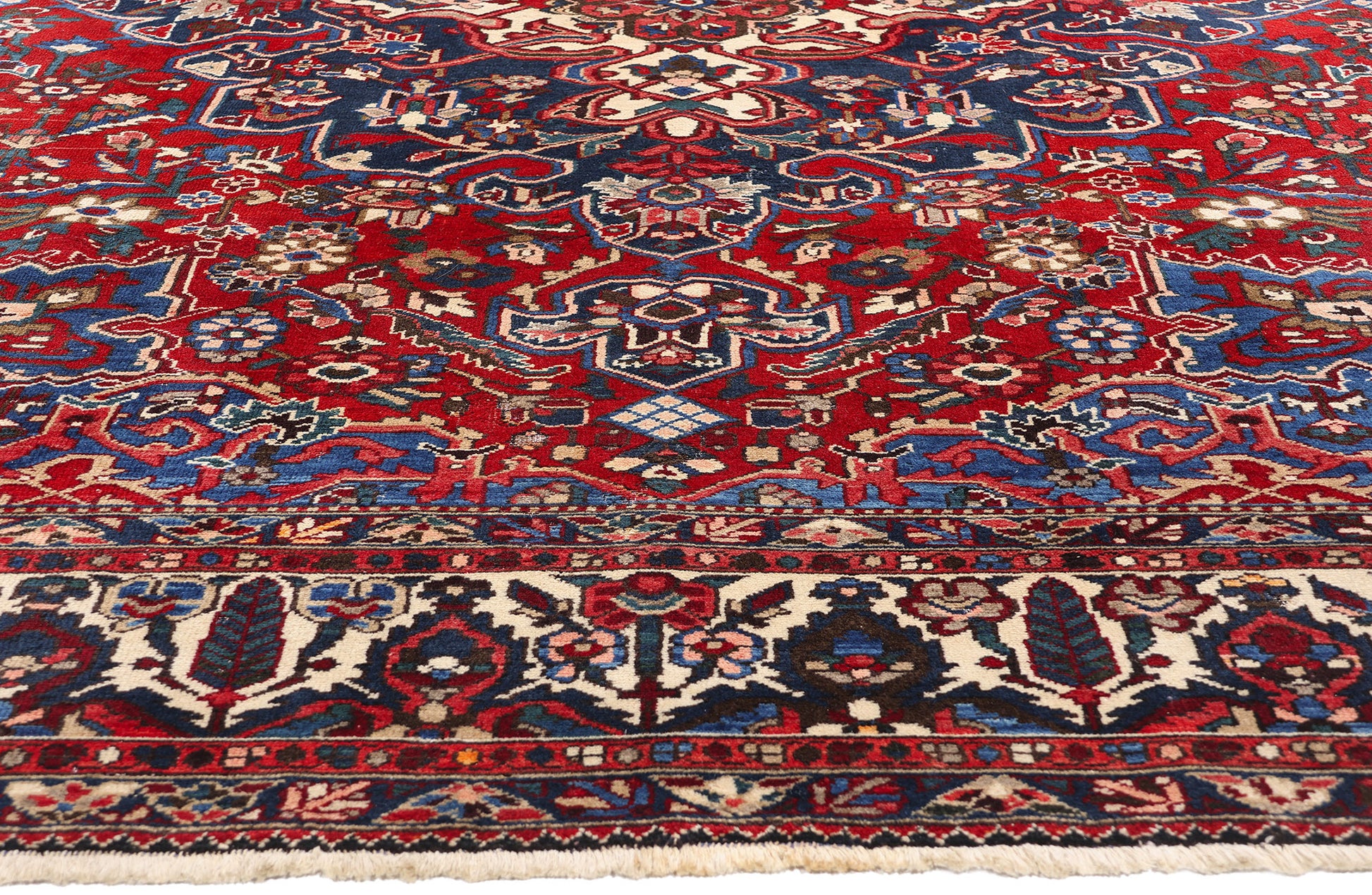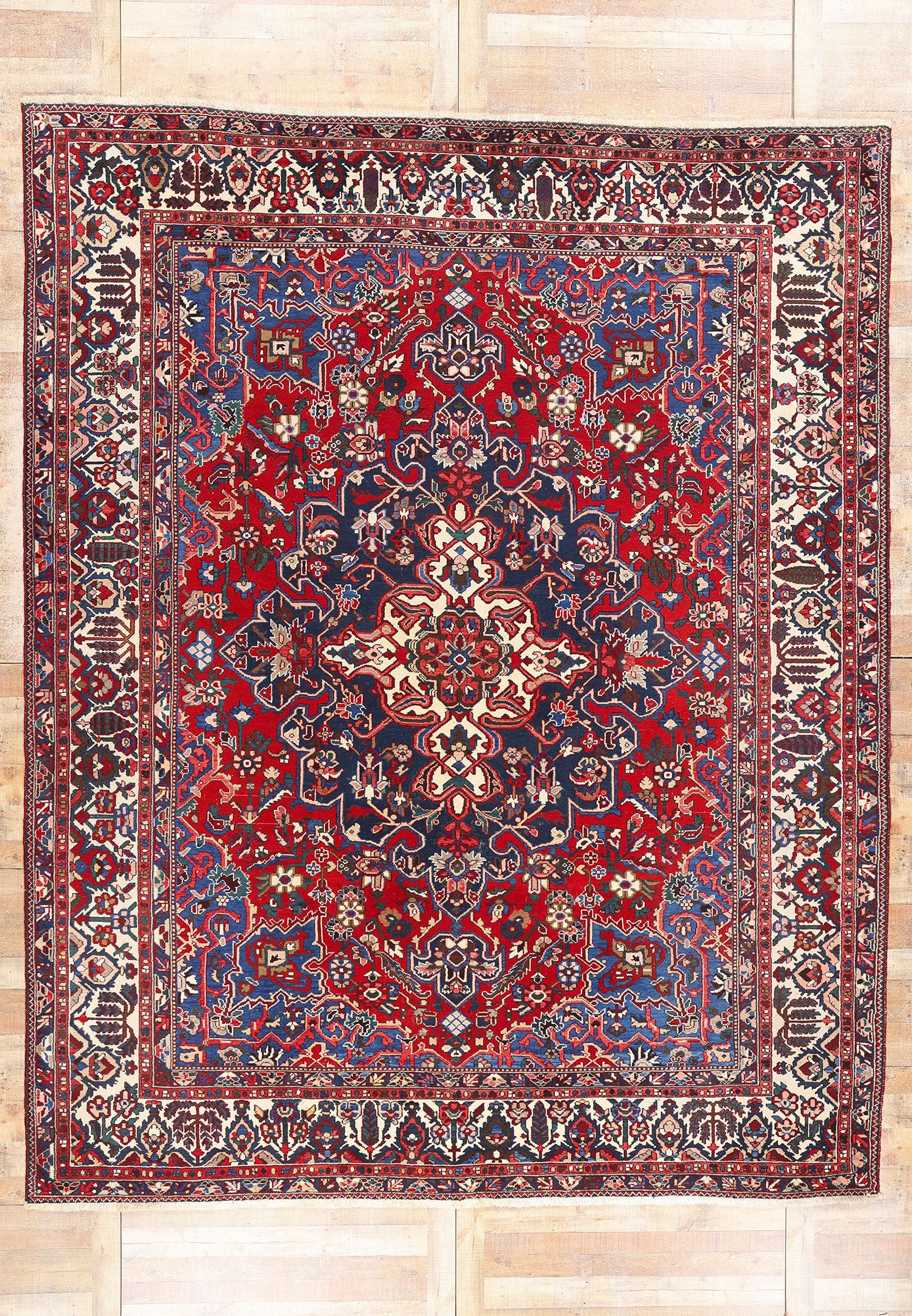 This hand-knotted wool antique Persian Bakhtiari rug radiates timeless beauty and artistry, epitomizing the rich cultural heritage of the Bakhtiari tribes. The centerpiece of the composition is a striking concentric medallion, elegantly anchored with trefoil pendants at either end. This medallion commands attention with its intricate detail and symmetry, drawing the eye to its harmonious interplay of floral and geometric motifs. The central medallion serves as a unifying element amidst the lively patterns, a hallmark of Bakhtiari craftsmanship.