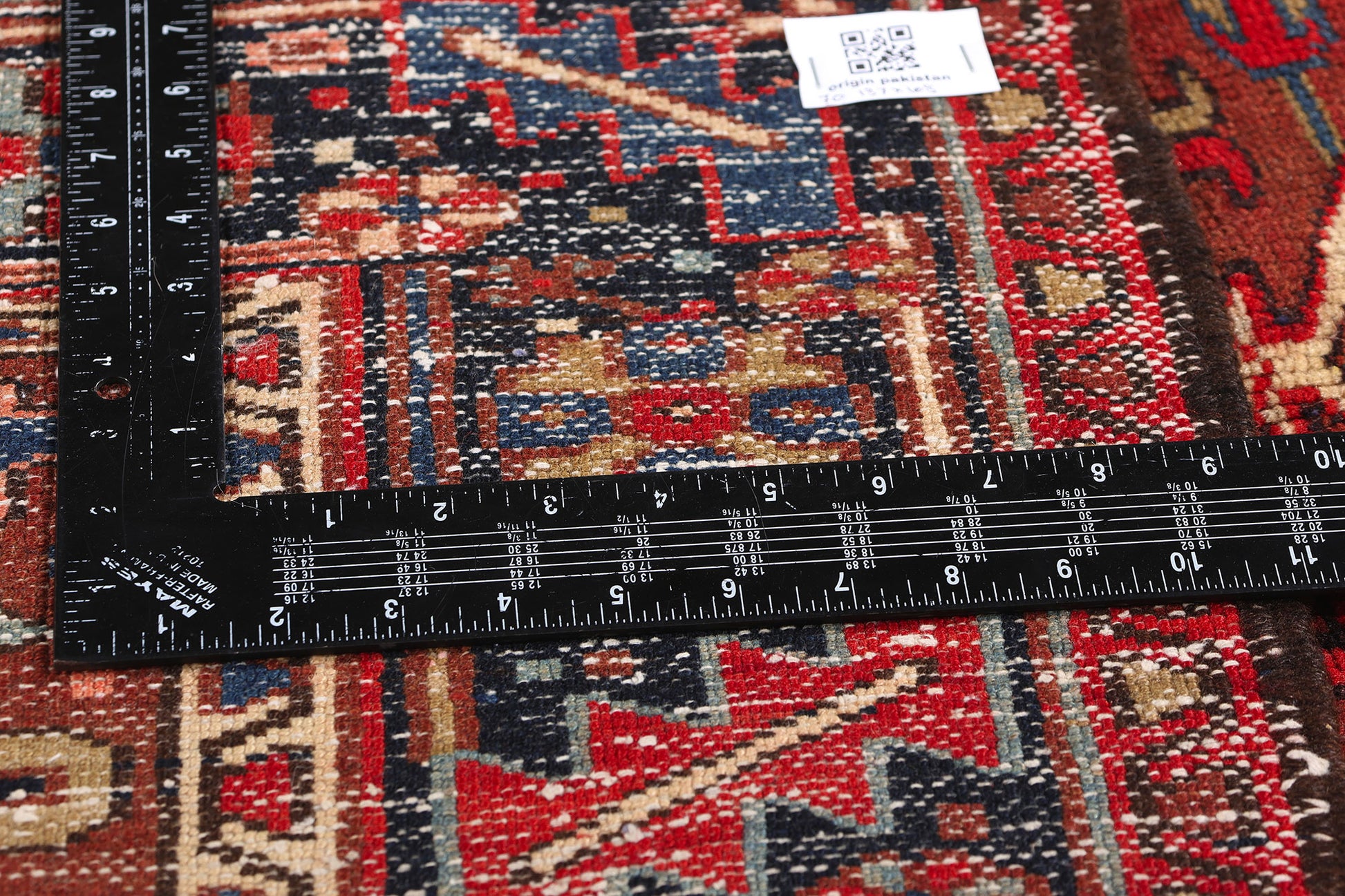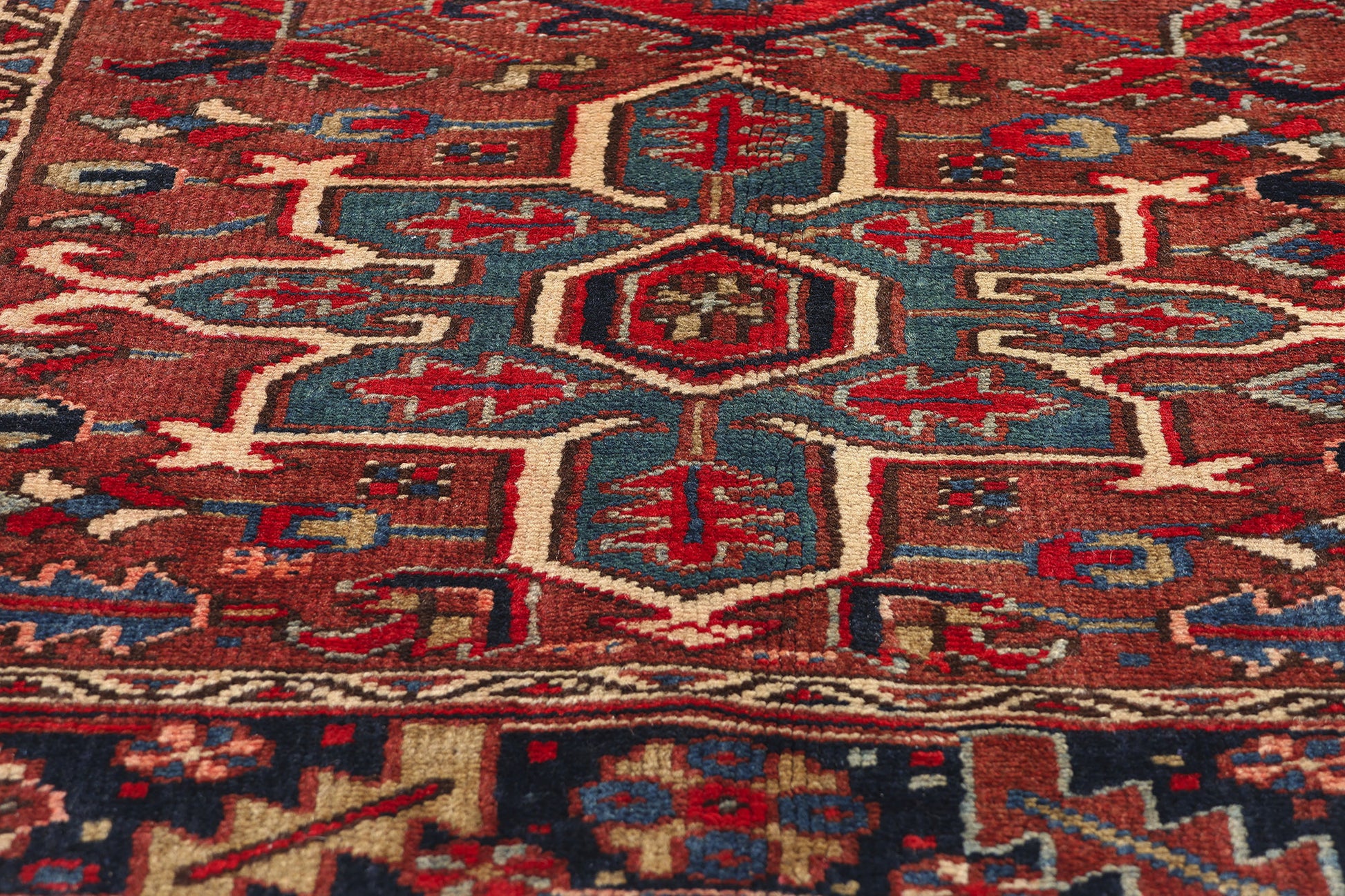 The vibrant palette of this Heriz rug is a celebration of nature's hues, with earthy reds, deep indigo blues, and soft beige tones creating a harmonious contrast. The cusped medallions and surrounding motifs are outlined in ivory, adding a sense of clarity and definition to the intricate design. The rosette and leafy main border is flanked by an inner and outer angular floral guard bands, creating a cohesive frame that enhances the rug's overall appeal.