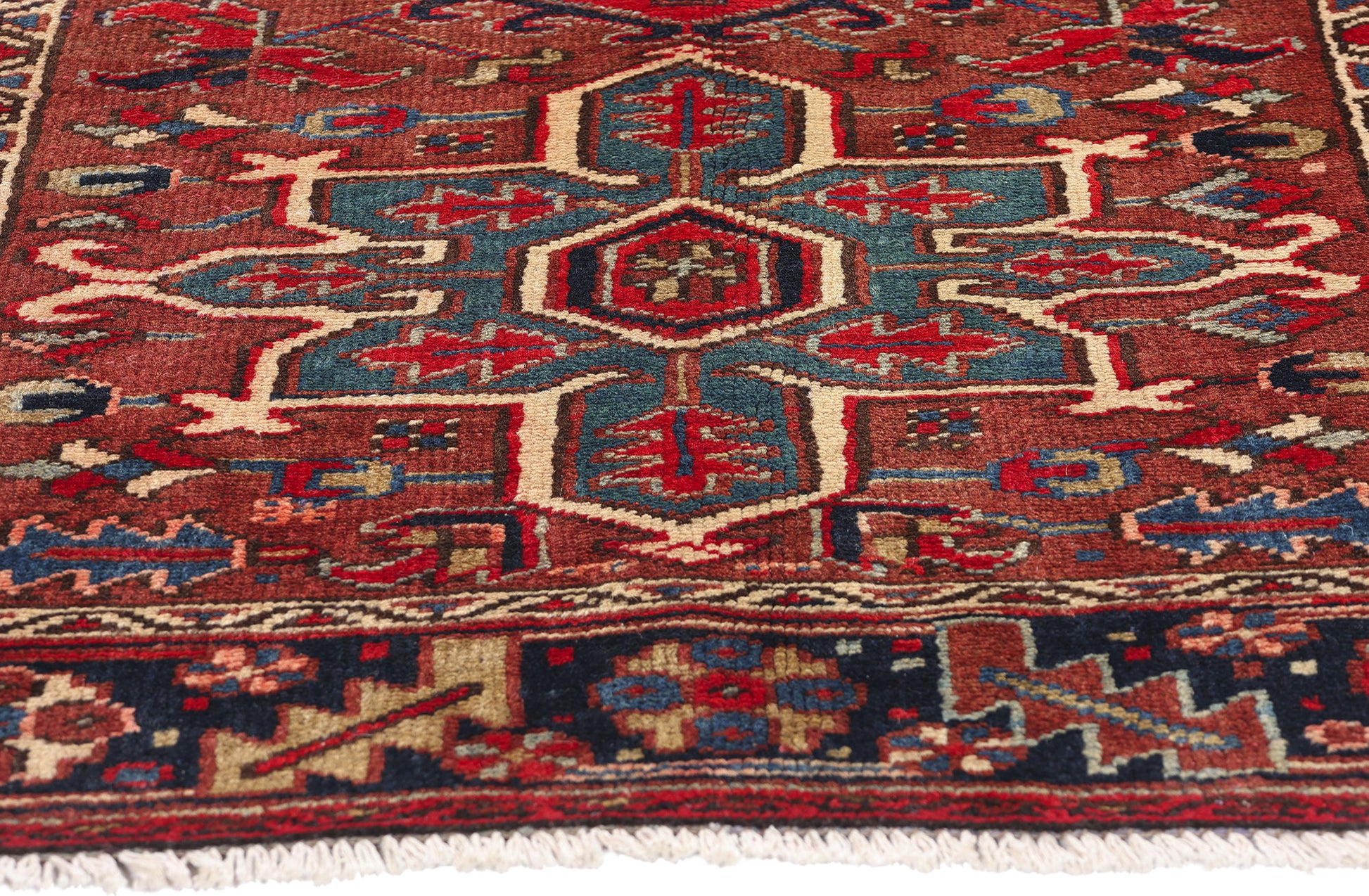This hand-knotted wool vintage Persian Heriz rug embodies the timeless charm of traditional tribal weaving, showcasing the vibrant artistry that has made Heriz rugs highly sought after for centuries. The Heriz rug's central hooked lozenge medallion captivates with its bold geometric design, anchored by cusped octofoil pendants at either end. An array of intricate botanical and tribal motifs dance across the rich red field. This striking composition exudes a sense of symmetry and balance, reflecting the skill and artistry of the weavers who crafted this piece.