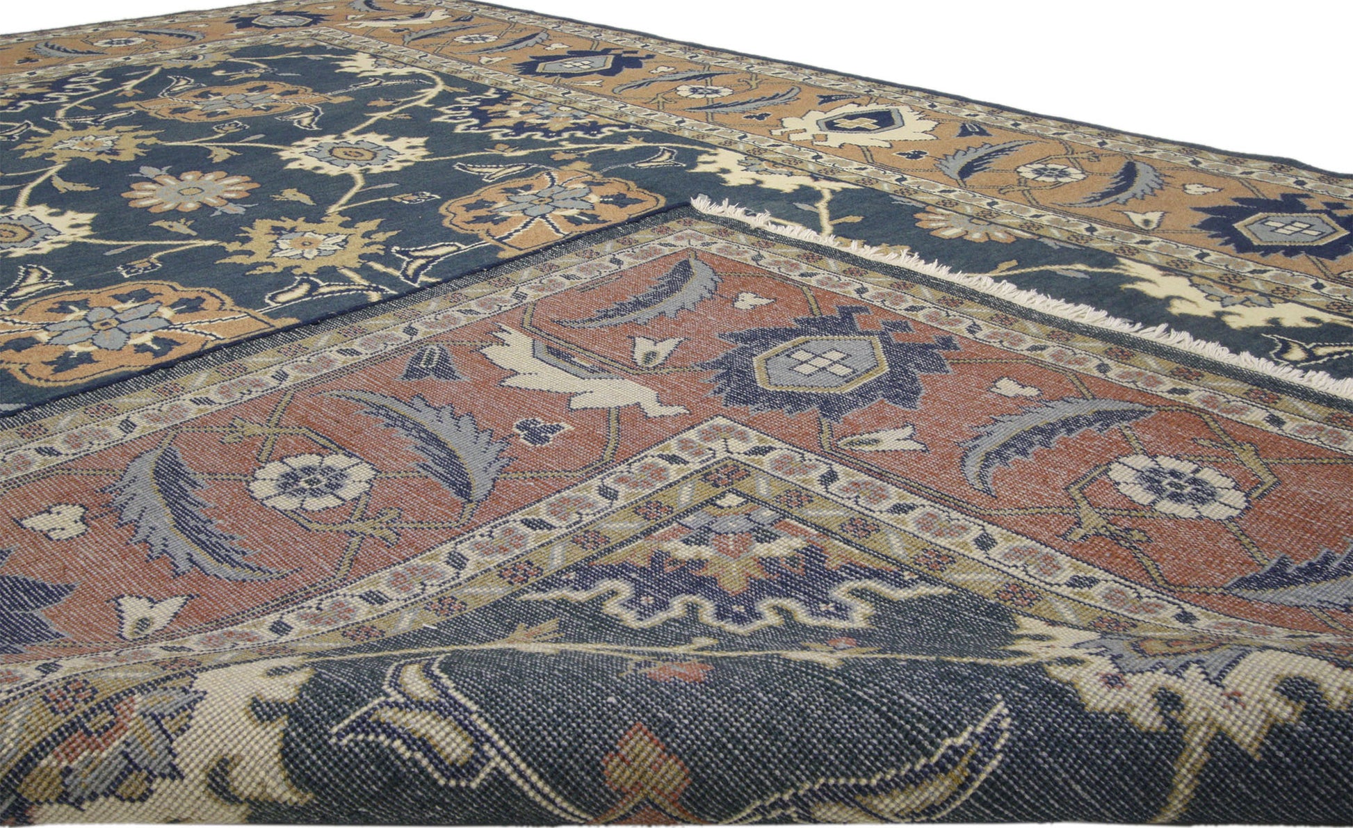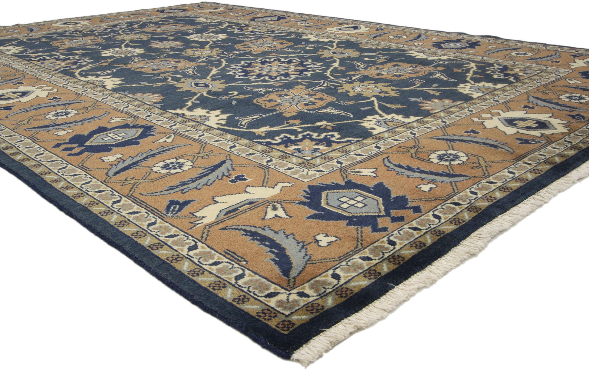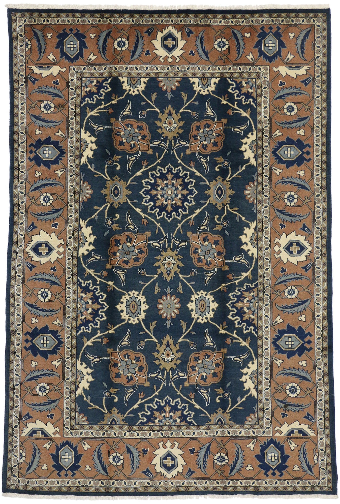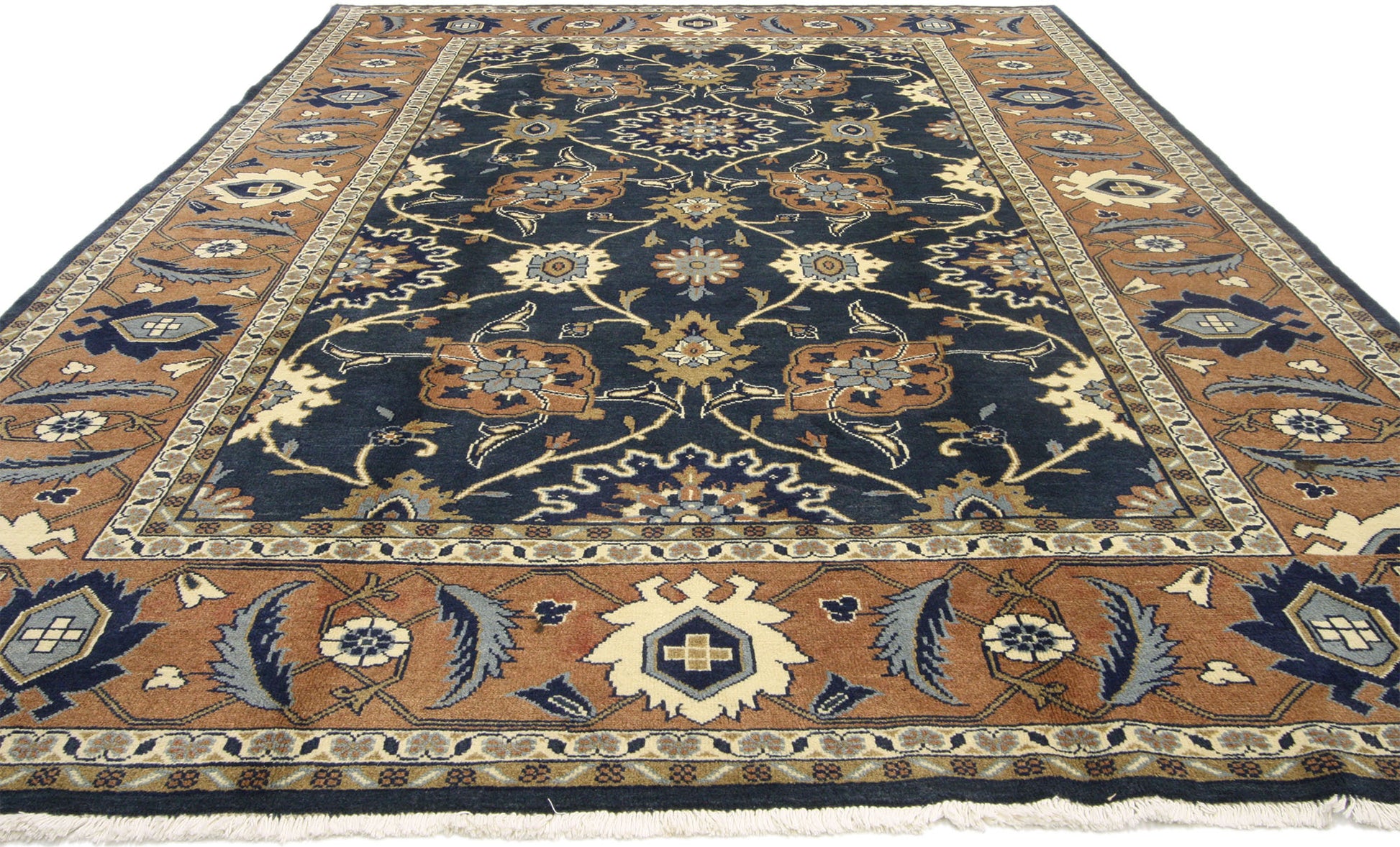 75848 Vintage Persian Mahal Rug with Mina Khani Pattern and Spanish Revival Style. With a beautiful fusion of Spanish Revival style and modern design aesthetic, this hand-knotted wool vintage Persian Mahal rug effortless blends the neutral hues with the contrasting navy backdrop. A large-scale Mina Khani design composed of flowers, palmettes, and arabesque vines is spread across the navy field. It is enclosed with a Herati palmette border flanked with an inner and outer carnation Meander guard border and subsidiary floral meander stripes. With a gorgeous color palette and impressive display of floral designs, this vintage Mahal rug would bring a sense of vivacity and sophistication to nearly any space. Perfect for a state room, great room, drawing room, private library, private Chambers, living room, front room, dining room, billiards room, trophy room, game room, music room, formal vestibule, or hotel lobby. Well-suited for a wide range of interior styles: Traditional, Bungalow, Arts & Crafts, Craftsman, Industrial, Rustic, Lodge, Cabin, Eclectic, Modern, Mid-Century Modern, Contemporary, Cottage, Tudor, Victorian, Artisan, Edwardian, Queen Anne, Eastlake, Aesthetic Movement, Manor House, and Old World Style. Rendered in variegated shades of navy blue, glaucous, bluish-grey, brown, sienna, chocolate, tan, ecru, sand, beige, and taupe. Abrash. Hand-knotted wool. Made in Iran (Persia). Measures: 06'08 x 09'11.