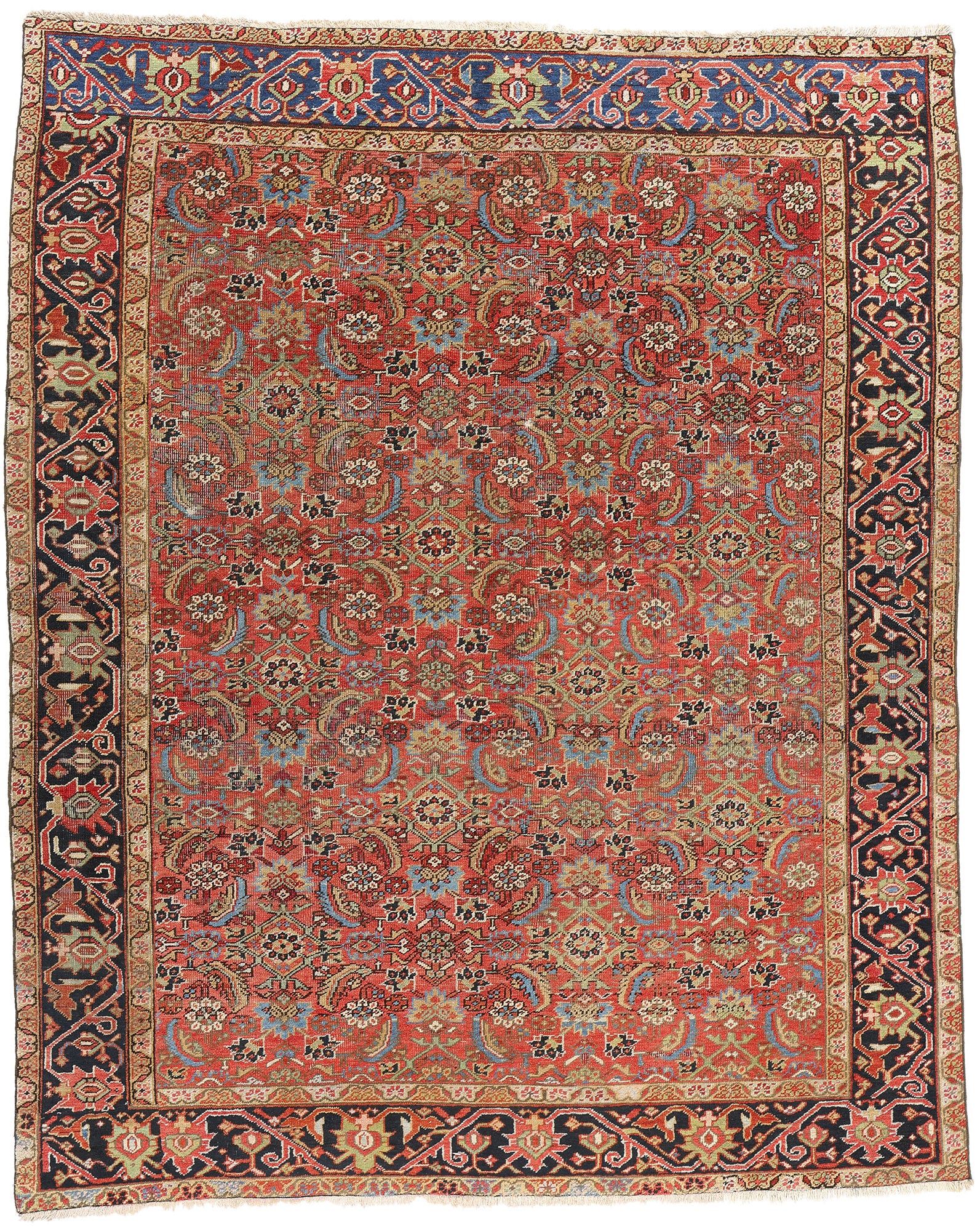 The classic traditional color palette of this antique Heriz rug is a rich and warm blend of reds, blues, and earthy tones, all set against a vibrant red field. The combination of colors is expertly chosen to highlight the intricate details of the Herati motifs, which include floral elements and abstract shapes. The use of these classic ivy league colors not only enhances the visual appeal of the rug but also adds depth and dimension to the overall design. The turtle vine scroll border, with its contrasting darker shades, frames the central field perfectly, providing a sense of completeness and balance. The carnation meander guard border, tying the whole piece together.