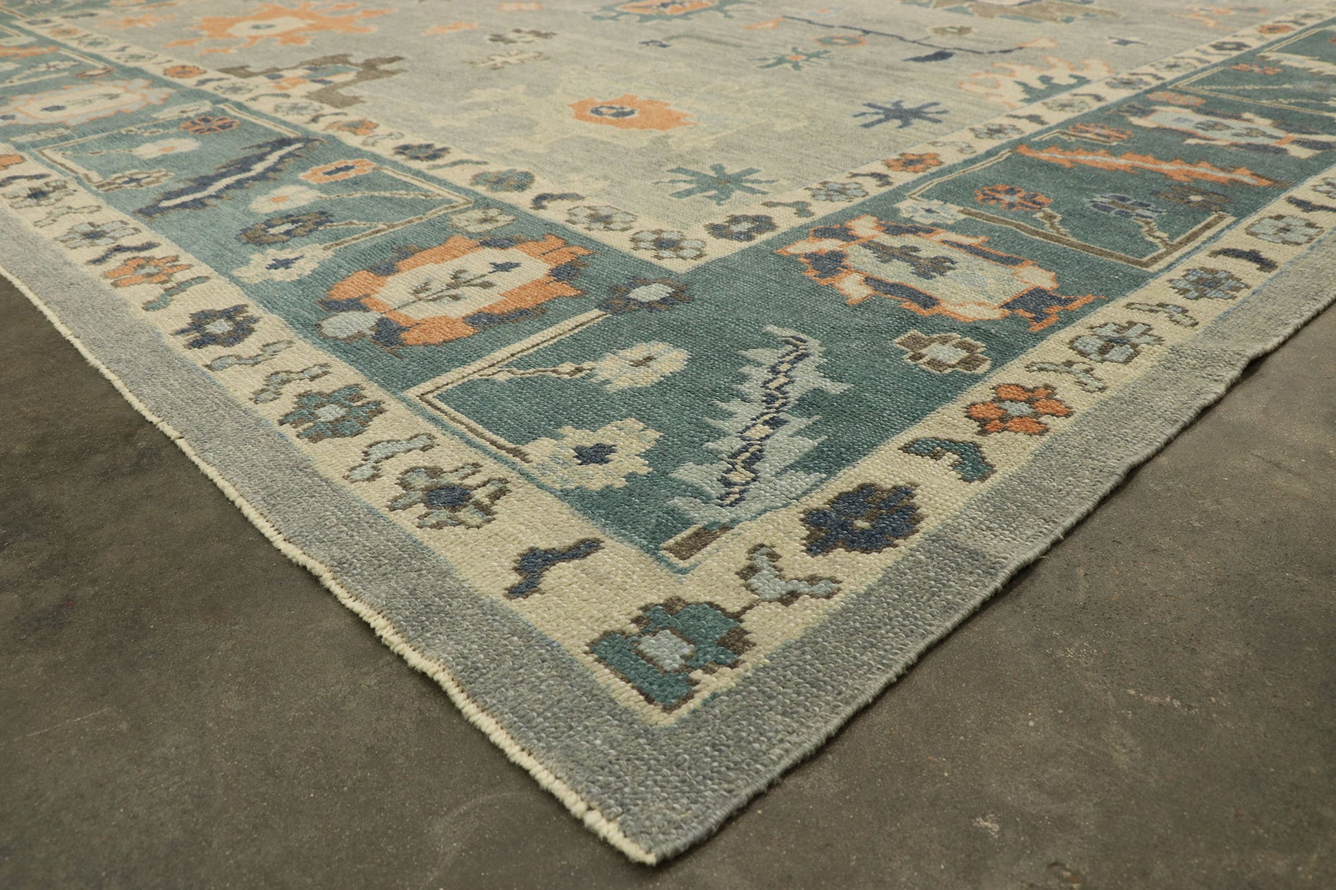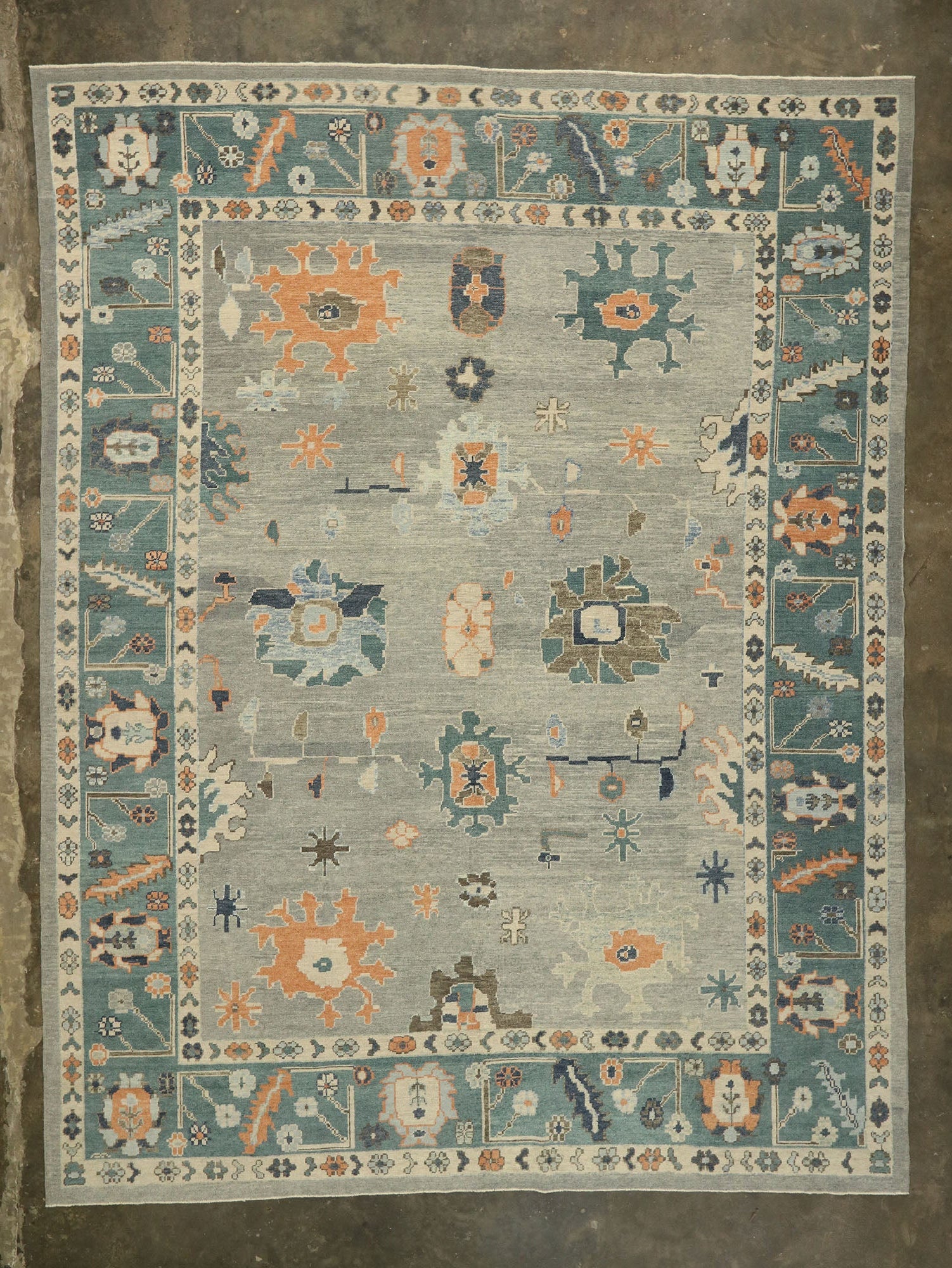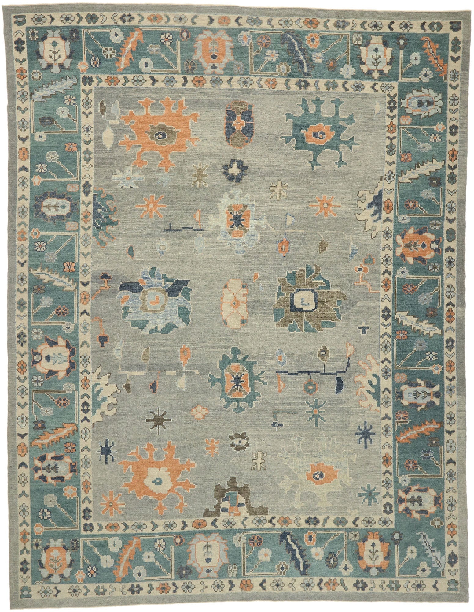 This hand-knotted wool modern Turkish Oushak rug features an all-over botanical pattern composed of Harshang-style motifs, palmettes, stylized florals, organic and amorphous shapes spread across the gray hued background. It is enclosed with a complementary botanical border flanked with an inner and outer floral guard band. A dynamic fusion of contemporary trends and modern vibes found in this new Oushak rug prioritizes comfort without compromising on style.