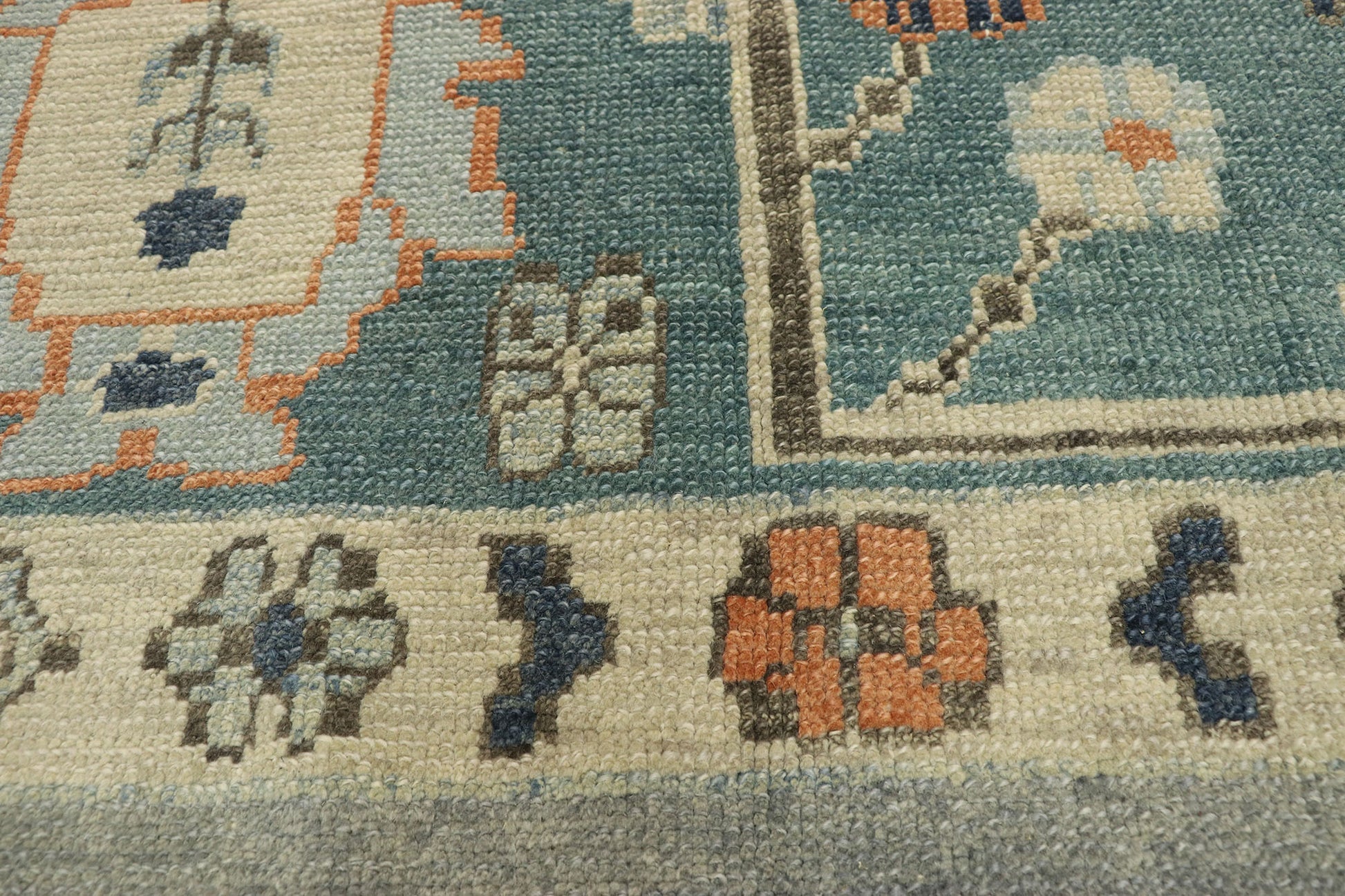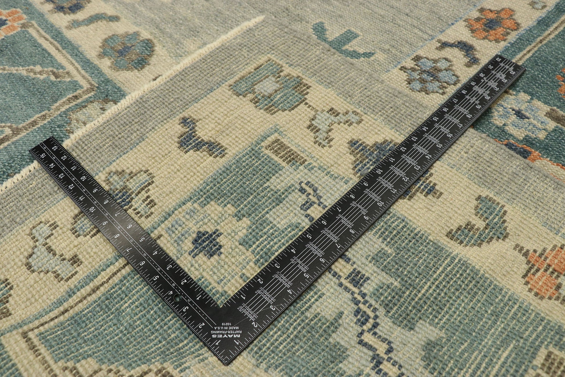Perfect for adding organic textile sensations to a living room, family room, bedroom, front room, home office, private library, billiards room, game room, study, studio, sitting room, theater room. Layer on-top of a sisal or jute for a coastal boho or contemporary nautical vibe. Well-suited for a wide range of interior styles: Contemporary, Modern, Boho Chic, Tribal, Cubism, Surrealism, Abstract, Transitional, Mediterranean, Greek, Italian, Egyptian, Retro, Abstract Expressionism, Regal, Renaissance, Cottage, Bungalow, Neoclassical, Regency, Industrial, Eclectic, Art Moderne, Colonial Revival, or Traditional. With its blissful vibes and subtle hues, this Oushak area rug would make a wonderful addition to seaside interiors such as: The Hamptons, Martha's Vineyard, Cape Cod cottage, Nantucket Beach, Beach House, Coastal Cottage, Lakefront, Seaside Sanctuary, or Lake Front Vacation Home. This Oushak area rug has been given a twist to effortlessly accompany today's modern interiors.