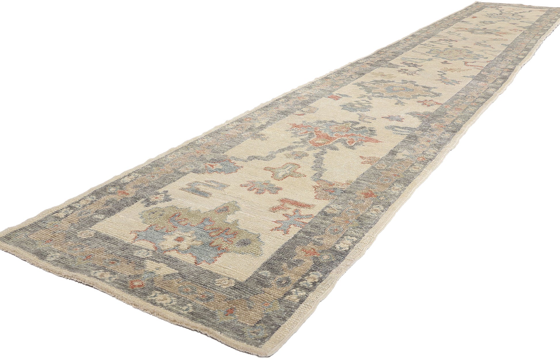 This hand knotted wool modern Turkish Oushak rug runner exudes a light and airy aesthetic that refreshes nearly any space with its subtle charm and intricate craftsmanship. The extra-long Oushak runner features a pale, neutral base, woven with a graceful allover pattern of botanical motifs and delicate floral arrangements that suggest the gentle touch of nature's hand. Each element within the design is thoughtfully placed, creating a harmonious visual flow that's both inviting and soothing.