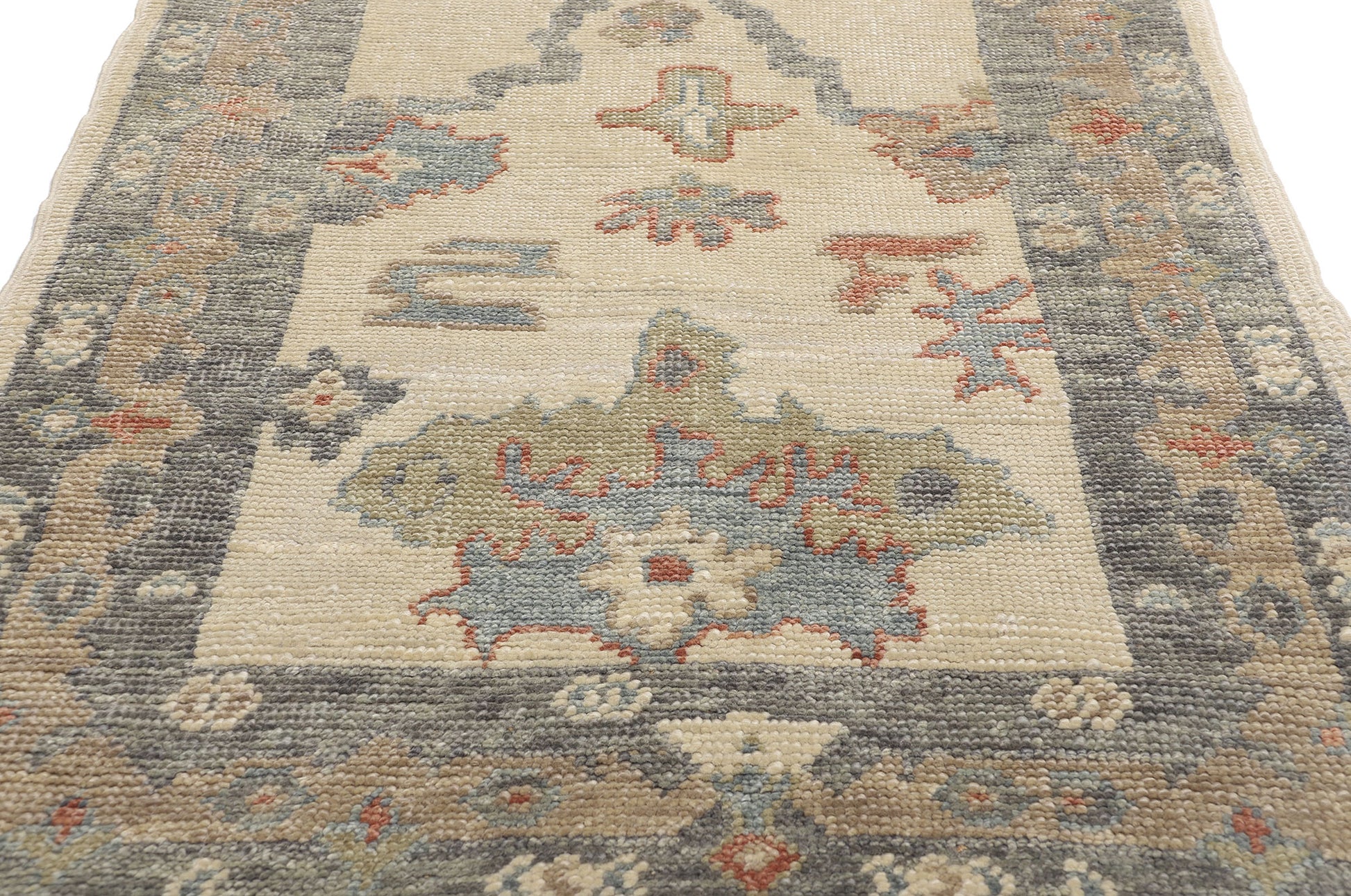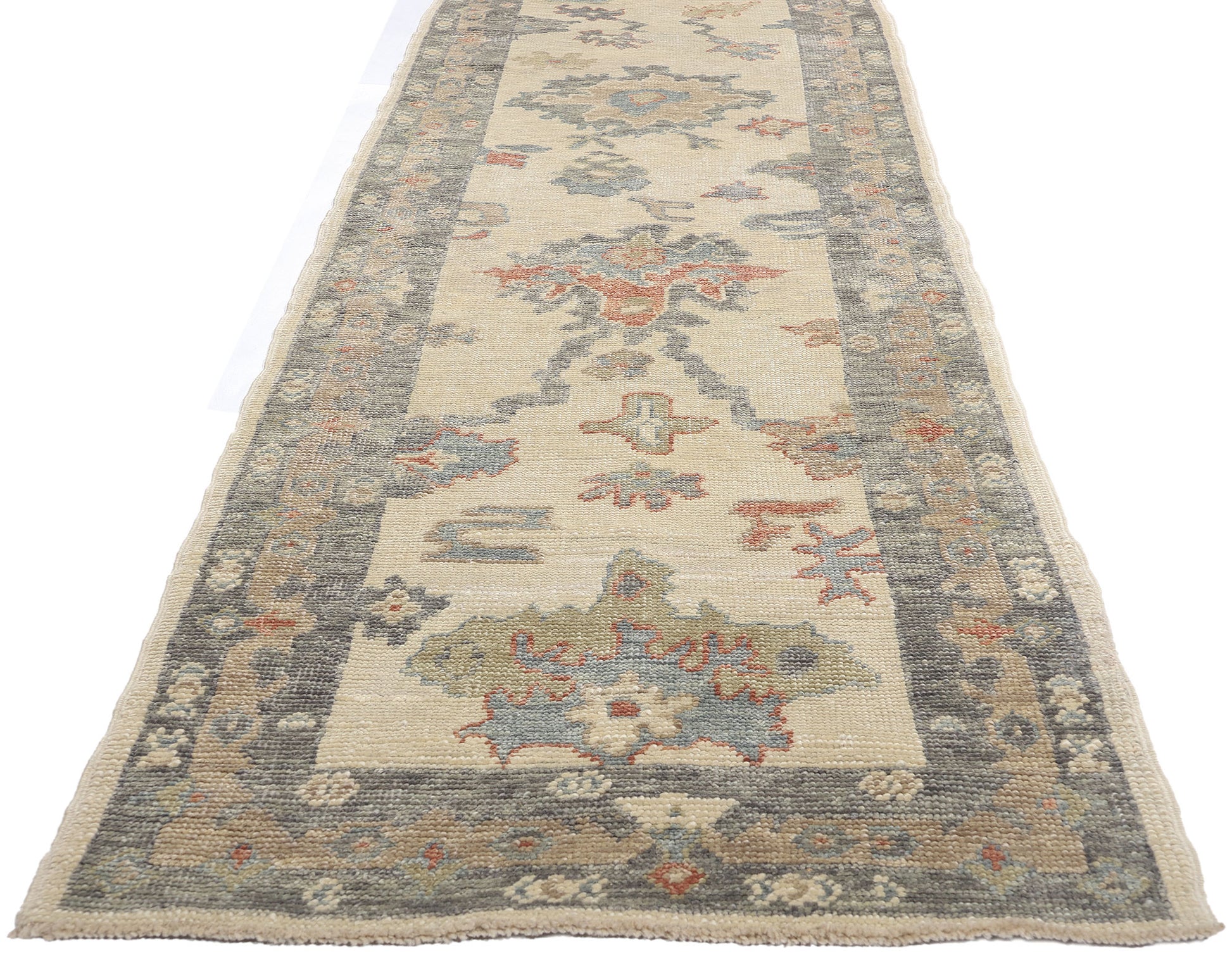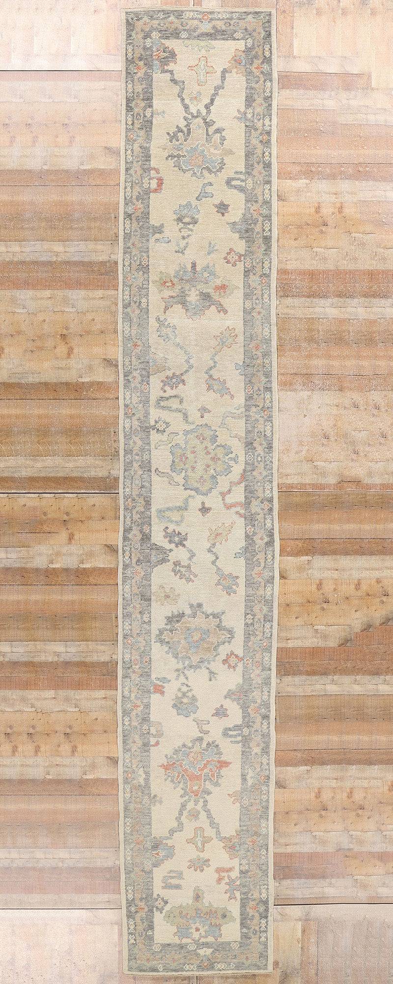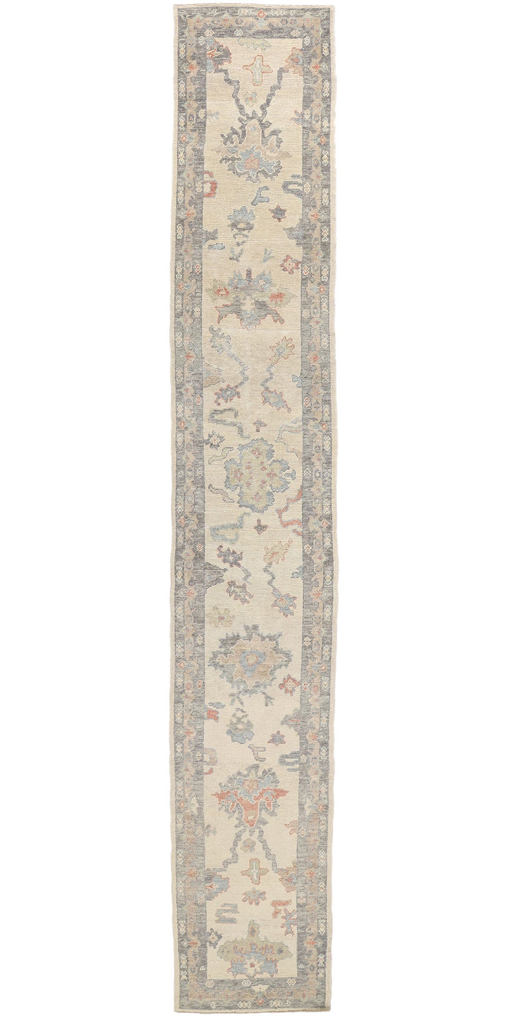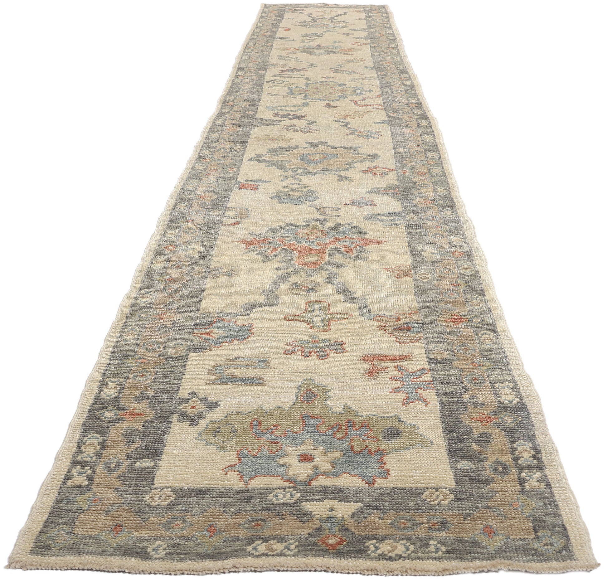 Enclosing the central field is an intricate botanical border that mirror the interior's motifs, adding depth and structure to the design. The main border is not just decorative but serves to frame the artistic composition of the runner, highlighting its elongated elegance. The use of faded colors within the borders gives the Oushak hallway rug a vintage look, suggesting a piece that has been cherished and worn, adding to its historical charm.