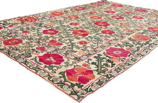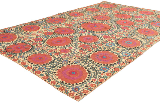 In the late 18th century, there was a revival of Suzani and Uzbek carpet production under the Emirate of Bukhara. New mulberry trees and silk weavers from Merv revitalized the industry, and Suzani weaving flourished. Many of the Uzbekistan rugs from this era are preserved in museums and private collections. At Esmaili Rugs, we feature a variety of Suzani textiles and embroidered panels that serve as both practical and ceremonial works of art.